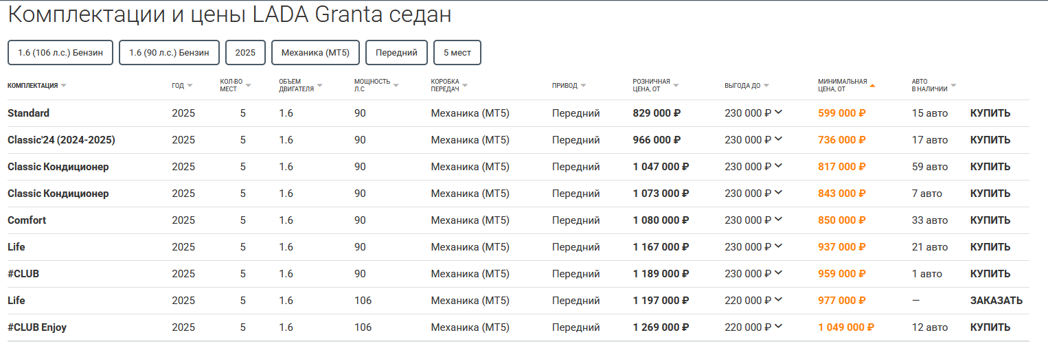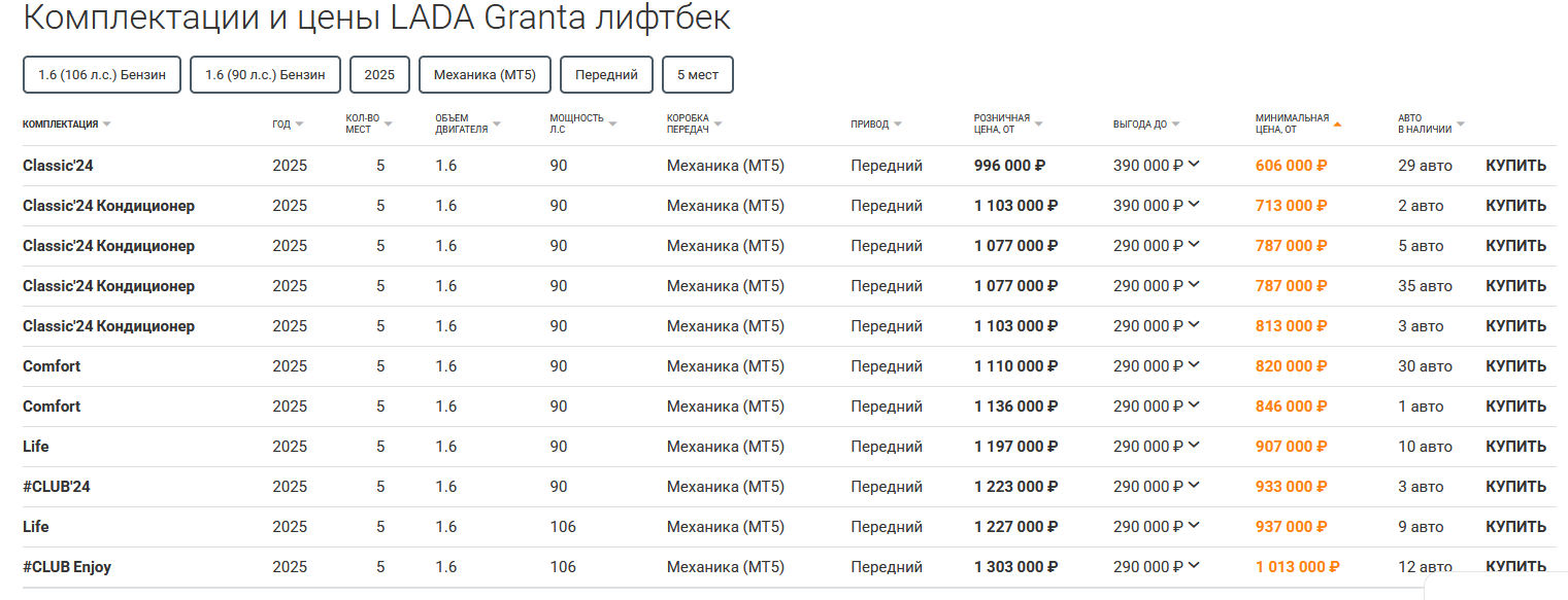 В 2021 я купил logan в life (база) за 680к. В без месяца 2026ом ВАЗ продаёт гранту в бомж+кондей за 1.050кк >там же есть за 829к Без кондея, наверное есть смысл брать под установку кондея, но это опять-таки платформа 2108, ржавение, ещё и седан. Лифтбек в "бомже" стартует с ляма, а с кондеем 1.1кк