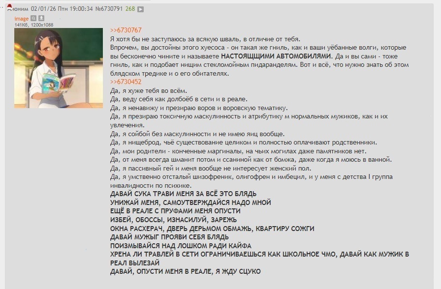 Вы пишете про Неосилятора, даже не зная его лично и ни разу не видевшись с ним вживую: мол, он воняет как бомж, питается на мусорках, денег не имеет, нужду справляет под себя, родители у него бомжи и наркоманы, а сам он психически больной инвалид и гомосексуалист, живущий в разрушенном доме без воды, света и газа. И говорите вы это всё лишь в сети, прямо как ссыкливые мальчишки лет 10-12 с визгливыми голосочками (наподобие ваших сыновей-наёбышей и выблядков), которые способны толпой залупаться на тех, кто морально мягок и слаб, но ссутся абсолютно всех, когда они по одиночке. Вот и вы также - в сети дохуя герои и брутальные мужики со стальными яйцами, а в реале всё своё дерьмо даже Неосилятору зассыте сказать прямо в лицо. Вы ничем не лучше его, даже имея крутые тачки и хорошую высокооплачиваемую работу, и после всех ваших высеров в разделе /au/ вас даже мужчинами назвать нельзя - так, сволота ебаная и конченные мрази, задирающие тех, кто слабее их и менее удачлив, кто не вписывается в ваш убогий ауе-манямирок. Вот и всё, что нужно о вас знать.