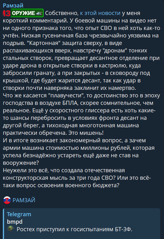 Вот именно, деб. А мы воюем в условиях, когда даже самая дорогая коробка ебется копеечным дроном. И бойцы выбирают багги без дверей, чтобы выпрыгнуть, а не медленные и большие бмп, которые превращаются в легкую мишень для фпв. И зонтики на танках не просто так, и ослы.