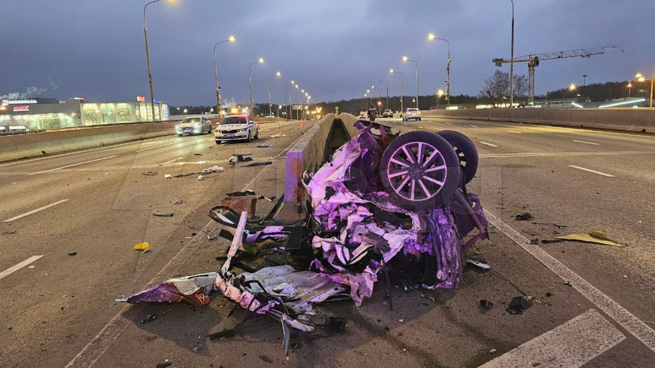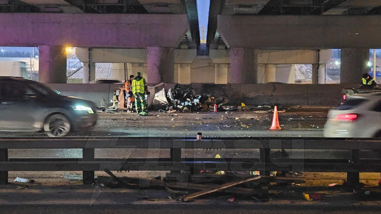 Автомобиль занесло, ударило об отбойник и разорвало: часть лежит на Алтуфьевском шоссе, а другая рухнула на МКАД. После ДТП начался сильный пожар.