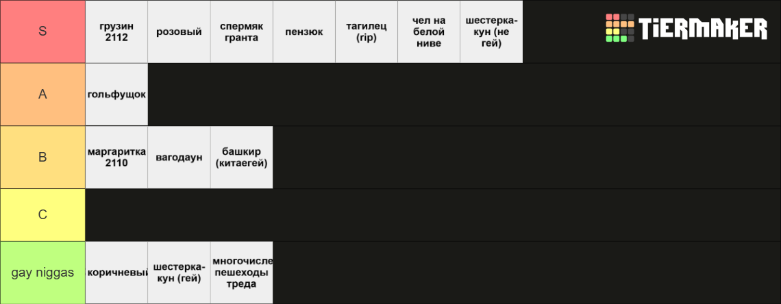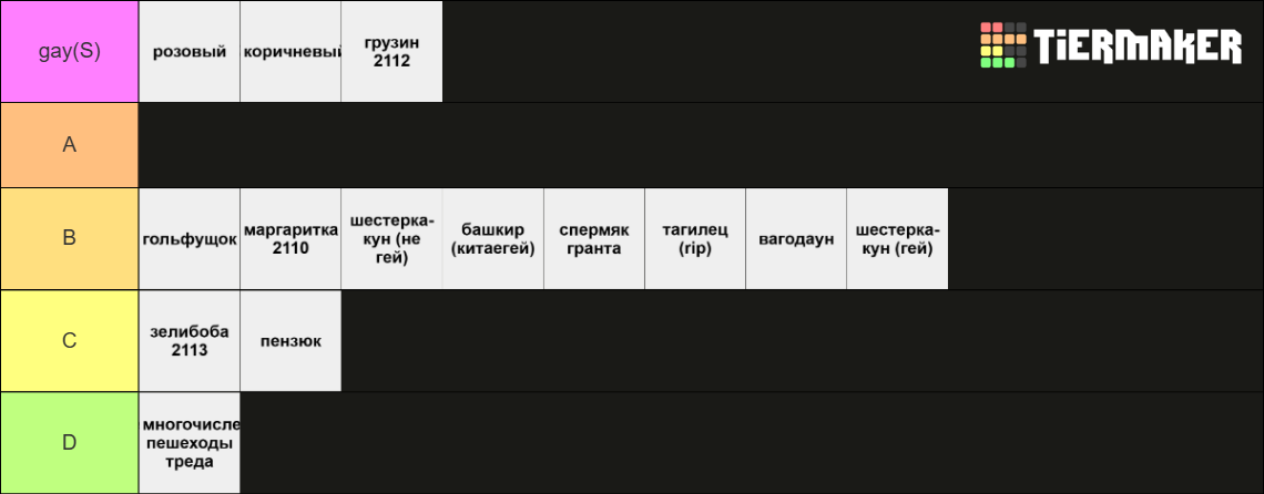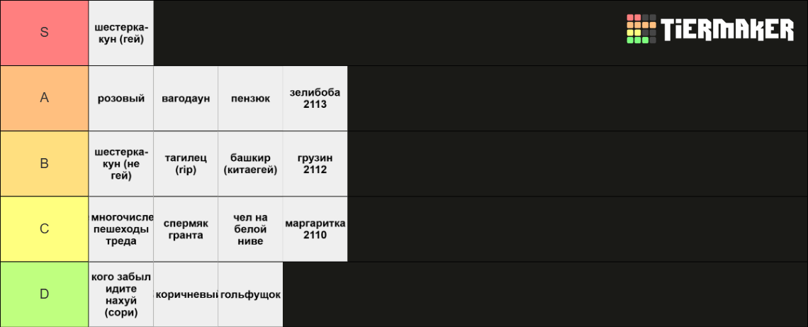 Как-то та видится. S: тупо местные петухи, отребье, сблев. B: есть они и есть. В зоопарке должны быть чем-то примечательные особи C: активно сношают свои тазы, что является сутью тазовладения D: двигают тред и не дают ему тонуть на главной и в говняке от asS-tier