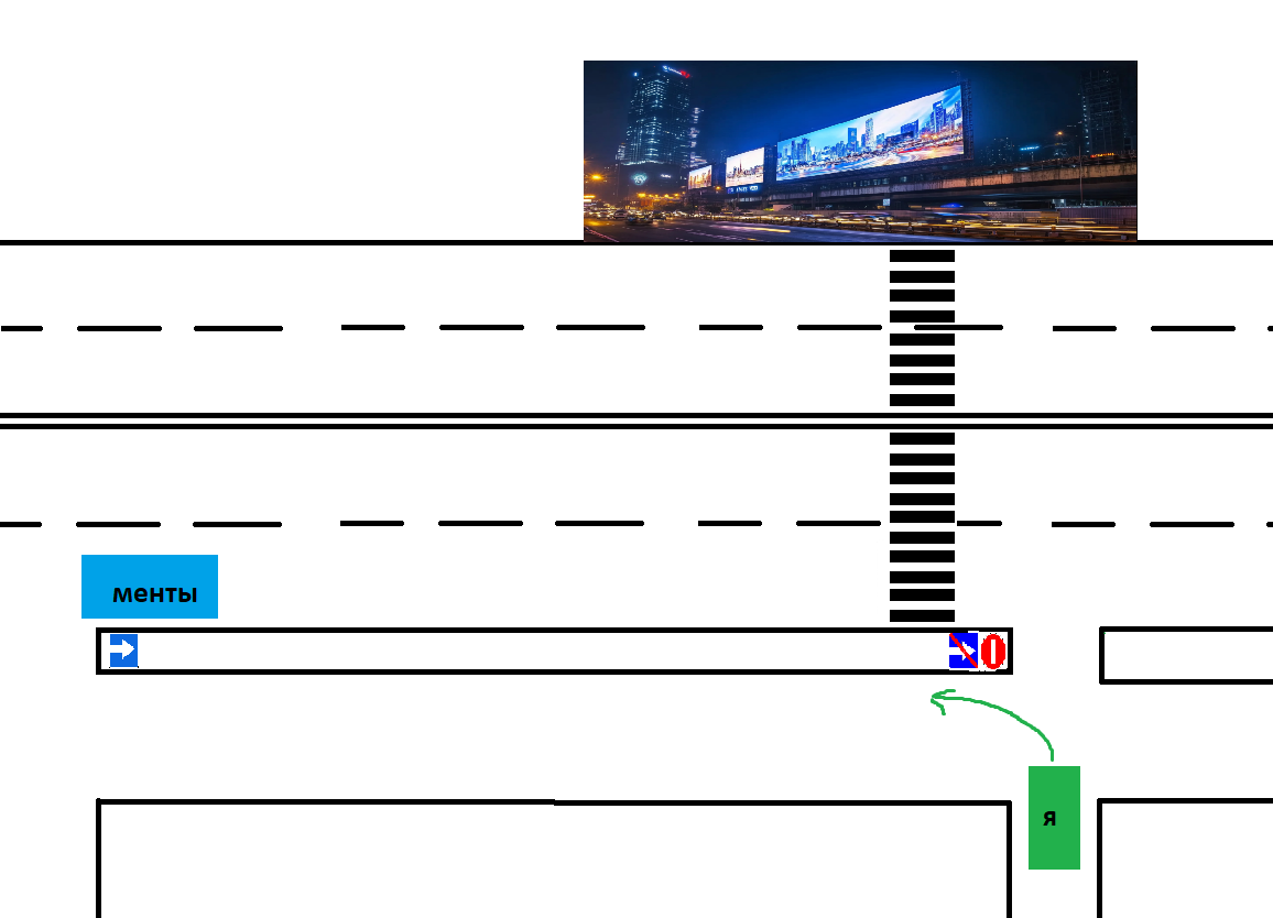 Двач, это пиздец, я обосрался по полной. Абсолютно ебанутая ситуация. В общем выезжал из двора на повозке (моя машина зеленая на схеме). Повернул налево, хотел припарковаться и вдруг увидел в зеркале заднего вида знак "конец одностороннего движения". Оказывается я проехал под кирпич и не заметил этого, когда повернул налево. Знак кирпича стоит практически ребром, если смотреть со стороны выезда из двора, а сразу за ним охуительно яркий огромный экран, высотой метров 20-30, который выжигает глаза. Плюс всё дело в ночной темноте, уличного освещения фактически нет, не считая этот ебучий экран. А ещё куча пешеходов и надо было ехать крайне аккуратно, чтобы никого не задеть. И, что самое поганое во всем этом - в конце улицы я увидел машину дпс с включенной люстрой и мент стоял, но вроде как не смотрел в мою сторону. Я пустил жидкого, быстро развернулся, припарковался и быстро ушел пешком во двор. Щас дошел до дома и сижу трясусь, что теперь будет? Они ведь заметили меня? Я не хочу лишаться прав блять