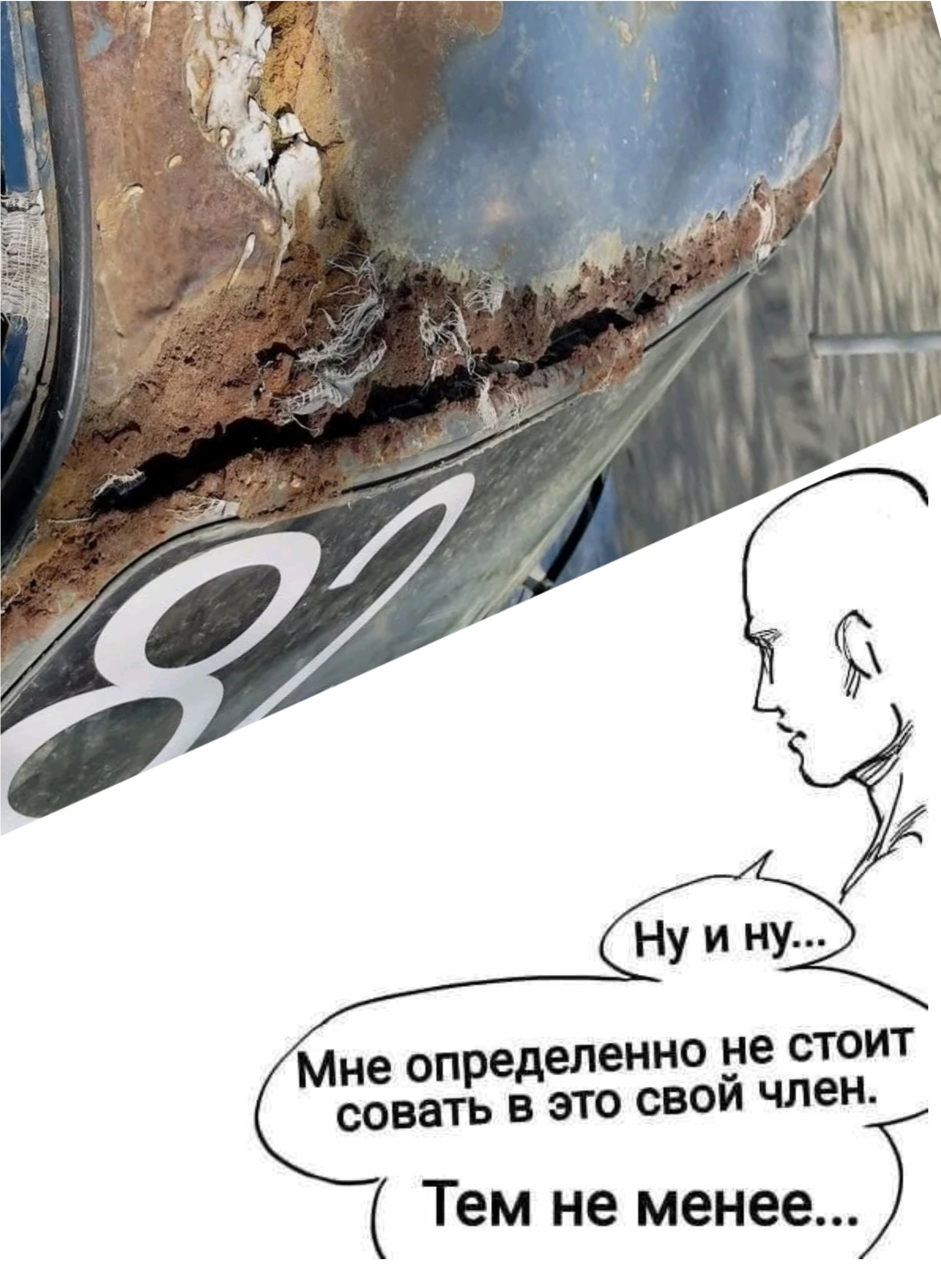 Имею таз когда-то из-под дида, который по итогу этого самого дида пережил. и пару последующих наездников Оттого жизнь таза была целиком и полностью рассчитана под продолжительность жизни дида и с появлением первых кузовных проблем машина была по низам обосрана им же чем-то вроде антигравия. Дед умер и вся эта скитлзтрянка через пару рук стала моим тренажером вождения минимального кузьмичевания. Собственно сам этот таз попав в мои кривые руки чего только не видел и по итогу одним летним вечером подвергся рейтинговой перекраске баллоном по ватерлинию. Если хлопушку я нормально шкурил, накинул шпатла, грунтовал и тп. То вот всё что ниже ватерлинии я тупо обосрал баллоном дабы авто заимело один цвет хотя бы с 10м. По итогу езды зимой и годового простоя в сыром гараже ржа почти ниоткуда не вылезла, кроме уже разложившихся на плеснь дверей (на пиках видно) и таких же местах на крыльях