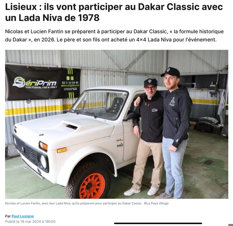 NICOLAS FANTIN (отец): «Мы с Люсьеном (прим.: Люсьен - владелец команды которая в 2024 году выкатила на старт те две нивы) всегда говорили, что вместе проедем ралли «Дакар». В 2024 году мы смотрели его по телевизору. Люсьен только что закончил учебу по специальности «туризм», и мы решили, что сейчас самое подходящее время. Мы встали с дивана и отправились в Rétromobile в Париже. Мы познакомились с Давидом Сейриесом и его командой. Он посоветовал нам пойти по экономичному маршруту, которым воспользовался Ромен Габовски, участвовавший в «Дакар Классик» на «Ладе Ниве». Мы встретились с человеком, стоящим за проектом Tout le Niva, который решил поддержать нас в нашем начинании. Все это было чередой встреч и взаимного энтузиазма. Normandy Rétro Prestige, крупнейшая французская компания по прокату исторических автомобилей для съемок, радушно приняла нас в своей мастерской. Один из их механиков, ставший нашим другом, помог нам, и он будет отвечать за техническое обслуживание машины на «Дакаре». Мы старались по возможности пользоваться услугами компаний из Нормандии, или, по крайней мере, французских». «По бюджетным соображениям, а также из желания показать, что не было необходимости привозить запчасти издалека или искать то, что у нас уже есть дома. Цель нашей ассоциации — объединять людей и вместе добиваться наилучших результатов».