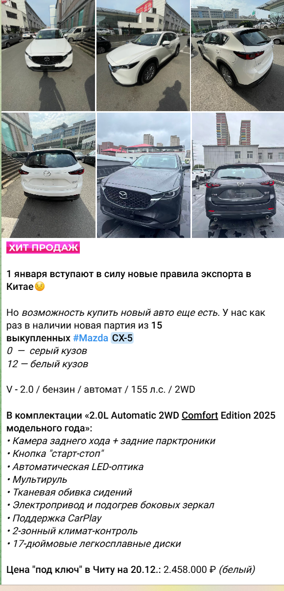 2. Далее добавляем запрет вывоза новых автомобилей из Китая который вступил в силу с начала 26 года и получится что распродают остатки новья по увеличенной цене На самом деле вывазить можно, но нужно гарантийное письмо от завода и еще не все экспортные фирмы знают как с этим работать и нет пока уже готовых примеров таких писем