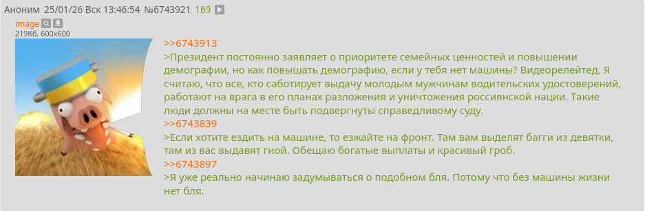 >>6743913 >Президент постоянно заявляет о приоритете семейных ценностей и повышении демографии, но как повышать демографию, если у тебя нет машины? Видеорелейтед. Я считаю, что все, кто саботирует выдачу молодым мужчинам водительских удостоверений, работают на врага в его планах разложения и уничтожения россиянской нации. Такие люди должны на месте быть подвергнуты справедливому суду. >>6743839 >Если хотите ездить на машине, то езжайте на фронт. Там вам выделят багги из девятки, там из вас выдавят гной. Обещаю богатые выплаты и красивый гроб. >>6743897 >Я уже реально начинаю задумываться о подобном бля. Потому что без машины жизни нет бля.