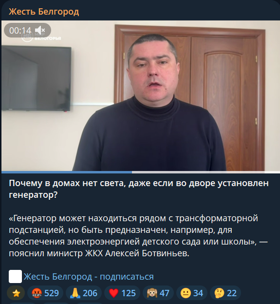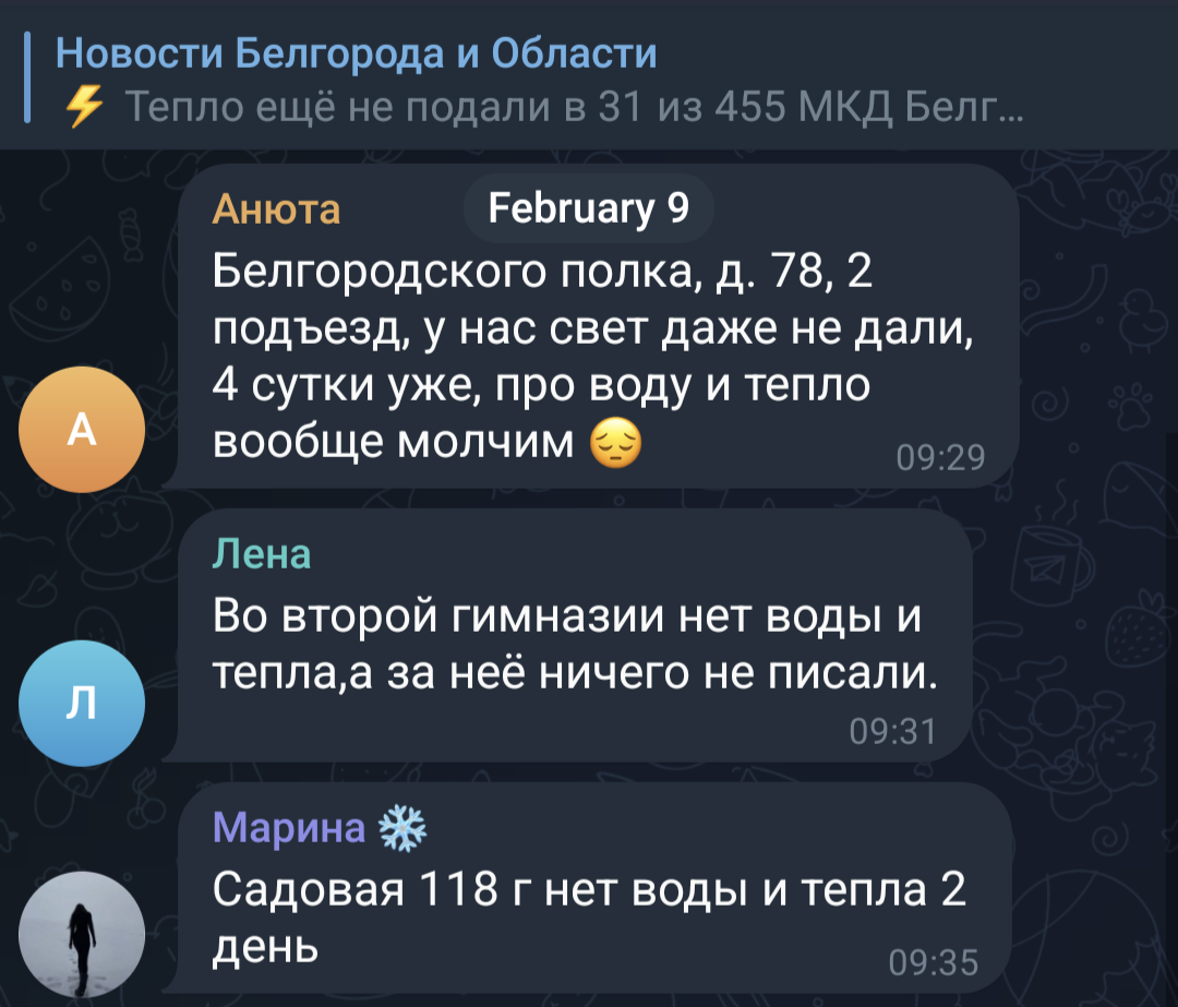 4. Самый большой ущерб наносится системам обеспечения света и тепла. За неделю с 1 февраля Белгород несколько раз оказывался без электроэнергии и тепла, и это — в аномальные морозы до -30°C;
