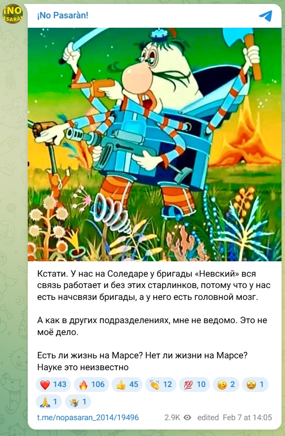 Базовичок Родригес из Но Пасаран говорит у них в бригаде со связью всё заебись и без старлинков. Впрочем его бригада входит в состав доброкора, а в доброкоре по слухам в целом очень ответственно относятся к боевой подготовке. И ваще не всё так просто со старлинками. Действительно был расслабон из-за старлинков, действительно вот прям щас массово нет нормальной альтернативы и есть проблемы. Порки даже взвизгнули что у москалей катастрофа, им подхрюкнули залетухи из верхнего телеграма. А базовички кто в теме лишь ухмыльнулись потому как знали что вот так всё именно будет и заранее готовились, и во многих подразделениях никакой катастрофы со связью нет.