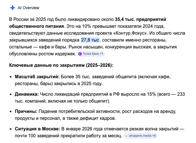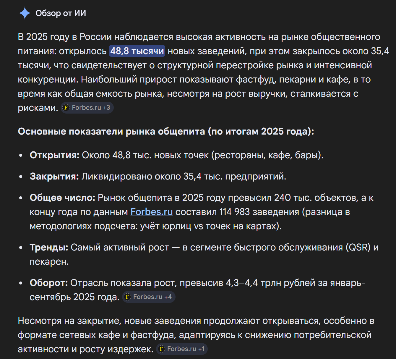 >>6760377 Свыня забыла скопировать текст до конца. Случайно, наверное? >По данным исследования «Контур. Фокус», в 2025 году в России было ликвидировано 35,4 тысячи предприятий общепита — на 10% больше, чем годом ранее. При этом рост отрасли замедлился с 5,52% до 4,62%. Несмотря на это, рынок продолжает обновляться: за прошлый год открылось 48,8 тысяч новых заведений.