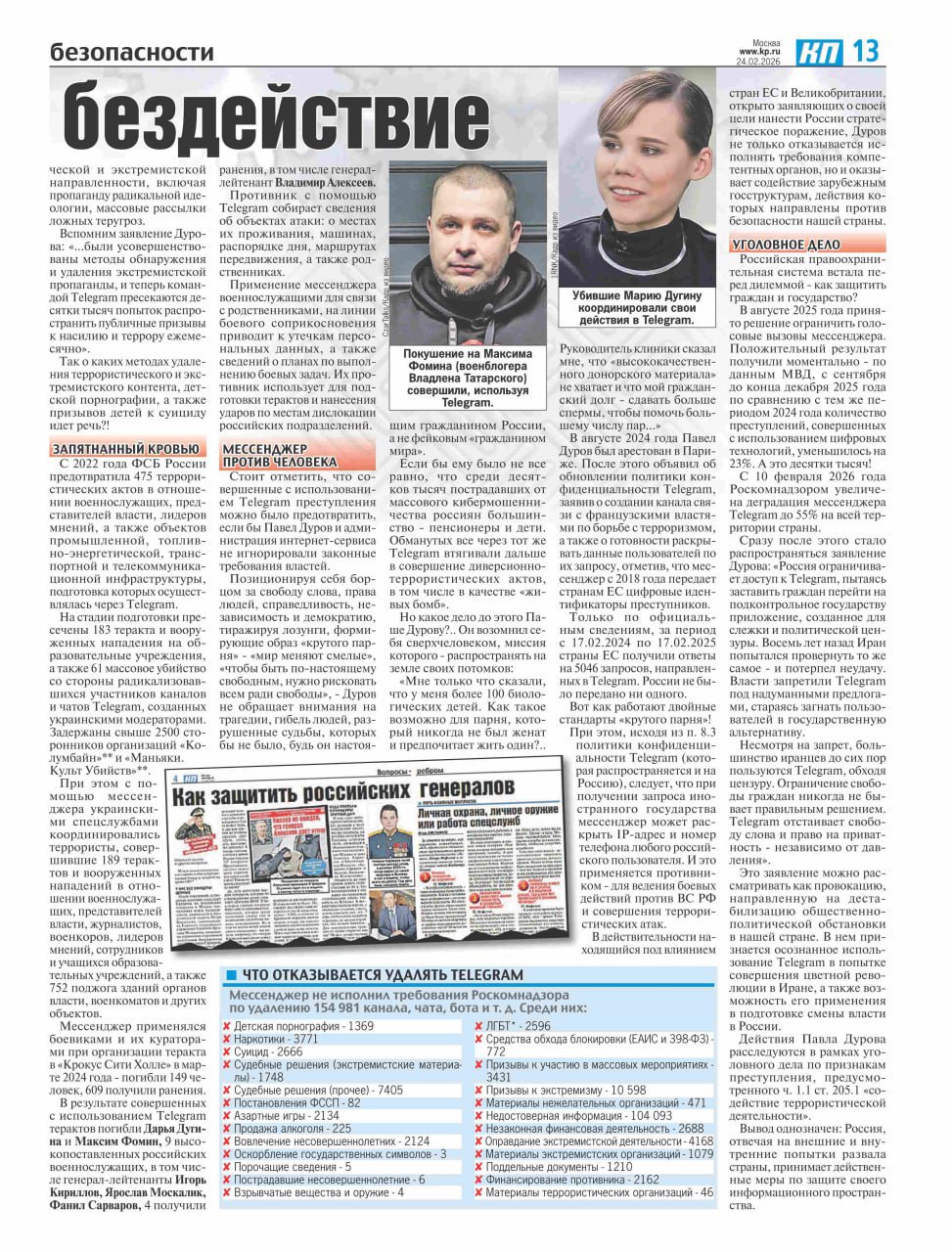 - Прочитал сегодня в газетах, что менеджмент Telegram виновен в покушениях на генералов и терактах, поскольку преступники использовали мессенджер для переписки. Планируются ли аналогичные санкции против производителей мобильных телефонов, операторов связи, производителей автомобилей, авиа- и железнодорожных компаний?