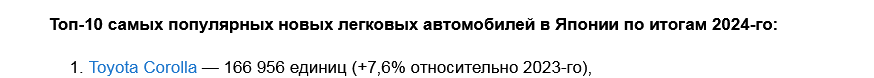 Toyota Yaris — 166 533 штуки (+0,2% относительно 2024-го), Toyota Corolla — 138 829 (-16,8%), Toyota Sienta — 106 558 (-4,9%), Toyota Raize — 100 851 (+96,9%), Toyota Roomy — 95 221 (+40,7%), Honda Freed — 90 437 (+5,9%), Toyota Alphard — 86 959 (+9,6%), Toyota Noah — 80 065 (+13,4%), Toyota Voxy — 78 760 (+11,5%), Nissan Note — 78 123 (-23,2%).