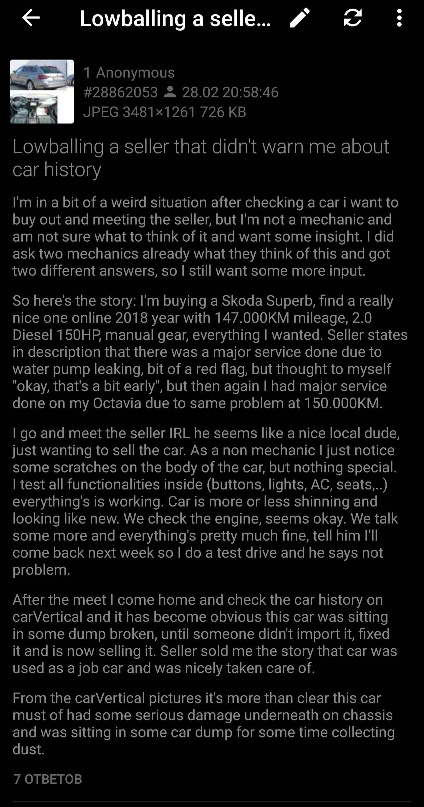 У перекупа в телеге аккаунт без имени, всё скрыто. Объяву дали на лохите с женского аккаунта и женщина говорила, что она не перекуп, ща дам вам мужа, потом перезвонил этот муж якобы и долго не признавался, что перекуп. Машина разумеется совсем на другого человека. Контакты собственника не дают для вписки в ЭПТС. Ещё показали сервисную книжку, где за 5 лет все записи одной ручкой, одним цветом и одним почерком, думаю, пробег скручен прилично.