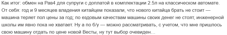 >>6771131 Прочитал пост где он за 2.3 сдал в салон машину. Кстати реально даже диллеры чунгачанги принимают машину с огромным дисконтом для продавца. Читал как одна сдала джили атлас после 3 месяцев использования за 2.8 при цене нового около 4. Но на авито я конечно такой щедрости не видел. Может и пиздят. Просто выезжая из салона теряешь миллион. Я бы и сам купил бы со скидкой нормальную машину, ибо так выгодней. Но я такого не встречал, пробовал писать и звонить продаванам на авито, но никто не идет на сбавление цены. Машина новая нужна, но из салона брать жаба душит после таких историй. Продолжаю наблюдать.