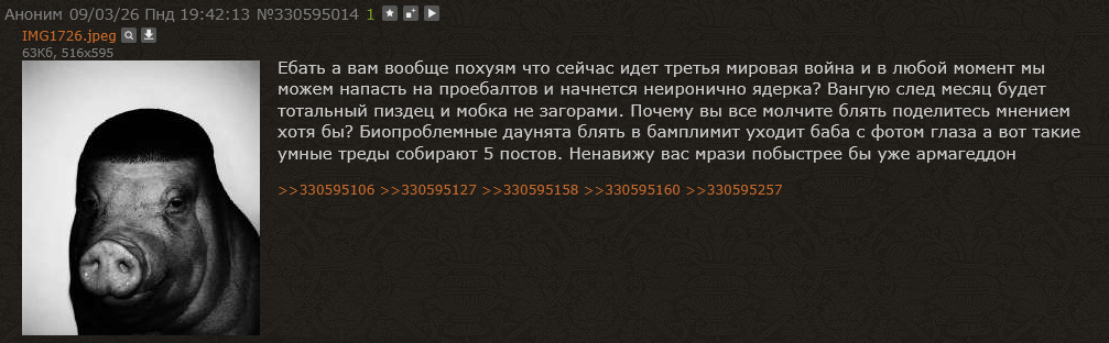 Тред удалили, но я всё таки отвечу. Ответ: > 4 5-ый год невойны > Ряяя это всё Во-первых, ты ОП , знатный слоупок. Во-вторых, все кто должны знать - те знают: Кабаны сидят на чемоданах, в своих джетах и ждут звоночка от дяди. Турбопатриоты уж давно закупились всей снарягой для проведения марш-броска до Лисабона! Бурундуки вырыли норки - закупились болторезами. Одни нормисы, ебаный биоскот , будут смотреть с выпученными глазами на атомный гриб, пока комбат, хлестая плетью , метерясь, погонит в штурм или в яму. Так что не вижи как свинья.