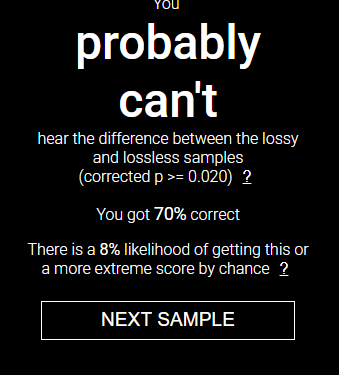 Ещё раз повторяю, про важность 100% результата, потому что я вот натыкал просто рандомно, нихуя не слушал даже, 20-ти попыточный тест и выбил 70%. Чисто по статистике возможны такие варики, они нихуя не доказывают. В целом мне тест и сказал даже в результате с 70%, что я "скорее всего нихуя не могу определить разницу".