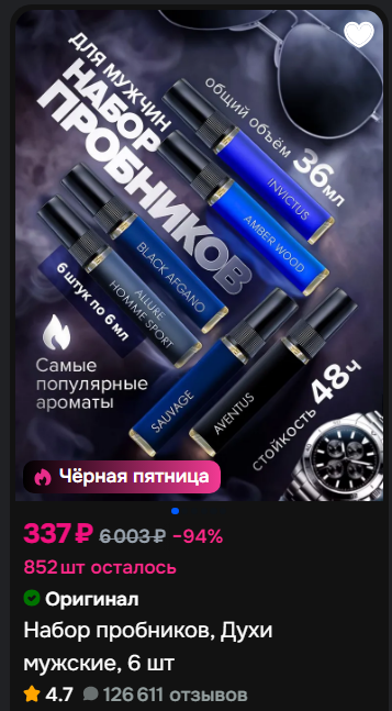 Империал мне пиздец нравиться, много тянок спрашивают что за парфим, особенно в лифтах когда прям плотный контакт и они прям нанюхиваются. Одного пшика хватает на весь день. Но мне начальные ноты вообще не нравятся, какая та приторная корица, но потом чуть подветреться и вообще люкс запах. Так вот хочу заказать пробников популярных запахов, и хочу спросить совета у гуру парфюмерии, может какой то парфюм по цена/качество, я тоже не 300к наносек. Готовые наборы с МП норм или это вообще скам и хуета??? может какие то, есть сайты где продают уже готовые наборы с ориг качеством? Где купить помогите???