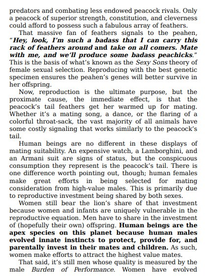 То есть Ролло Томасси говорит, что люди такие же как фазаны, у которых самцы привлекают своим ахуенным хвостом, сигнализируя о высоком качестве собственных генов. и пошло говно по трубам: An expensive watch, a Lamborghini, and an Armani suit are signs of status то есть генетические плюсы это ламбо, часы или костюм