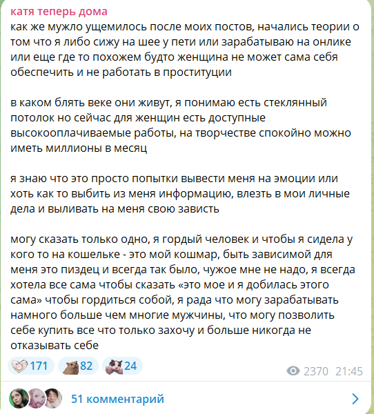 Пробейте вхору с пикрила, которая дохуя выебывается. Известная в прошлом онлифанщица, которая форсила себя по пабликам под ником aorta, несколько лет назад нашла питательного кунца и на свое хобби подзабила, перестала выкладывать нюдесы и ссылки на продажу. Преисполнилась и стала вести лайфстайл. Также известная радфемка и мужененавистница, при любом удобном случае агрессивно кидается на свою немногочисленную подписоту, если те задают какие-то вопросы, а не покорно облизывают пятки. С недавнего времени начала выебываться крупными материальными покупками под эгидой "МЫ купили". Я с этого сначала поржал, ведь данная авторКА целыми днями сычует дома и по рестикам, ни в какой деятельности замечена не была. После покупки трехкомнатной квартиры в центре Питера "МЫ внезапно купили" опять посыпались вопросы откуда деньги, не за счет ли ебыря, камвхора сгорела и выдала пикрил пост на горящей жопе. Из-за чего у меня подгорело, так это с чсвшного высера "СЕЙЧАС ОЧЕНЬ ЛЕГКО ЗАРАБАТЫВАТЬ МИЛЛИОНЫ НА ТВОРЧЕСТВЕ, ВЫ ВСЕ ДОЛБОЕБЫ НИЩИЕ". А про какое такое ее творчество речь и где она эти миллионы зарабатывает шлюха упорно умалчивает, кидается агрессивно на подписоту "вы долбоебы не лезьте не в свое дело, вас не касается, не обязана говорить", отвечает только наяривателям вареника, но покупками выебываться не устает))) Возник резонный вопрос: что это за творчество, которое так упорно скрывается и от чего так давит очко. Стало очень интересно, не замечена ли эта особа в продаже порнухи, или как вы могли такое обо мне подумать?? Делитесь мнениями, кто в курсе