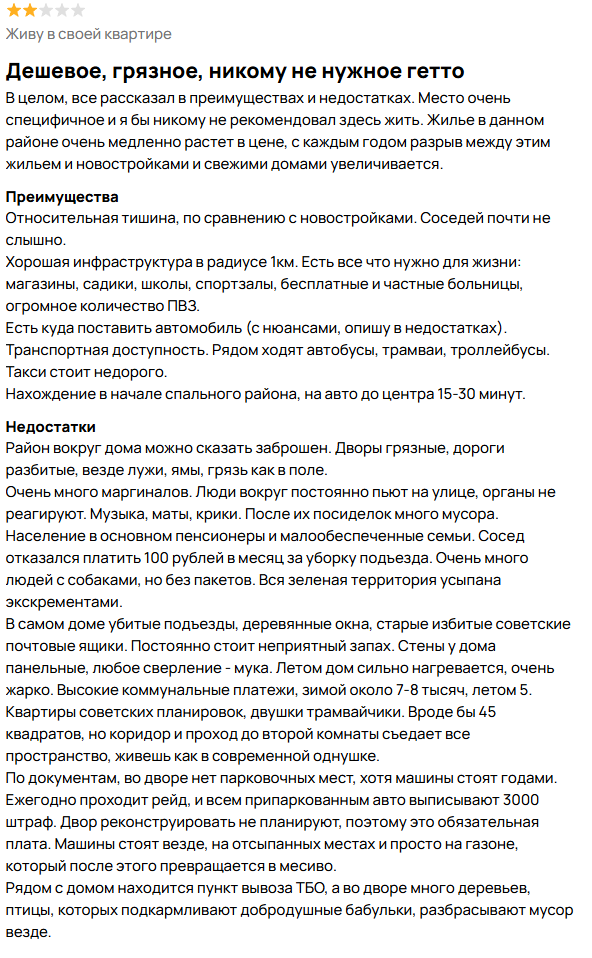 >>329716272 А я на все отзывы оставляю. Тем более это отзыв развернутый и независимый. Вот у нас дом, отзыв оставил подружка председателя. Цитирую: "Хороший двор все ремонтируется убирается низкие коммунальные платежи". Ремонтируется - ложь, дом буквально разваливается. Убирается - ложь, дворника у нас нет, люди от безысходности убираются сами. Низкие коммунальные платежи - ложь, за январь 2026 года 7100 за ЖКХ, плюс 1000 свет, 300 газ. И это ТСЖ, не УК. Что в УК боюсь представить. Если я напишу реальный, независимый отзыв про дом, а потом еще пару обращений в налоговую и пожарную инспекцию, ибо ежегодные отчёты ТСЖ не публикует - эт нарушение закона, а лестничные клетки заставлены колясками и ватрушками - это нарушение пожарной безопасности, никакого ТСЖ не будет и председателю придется побираться...