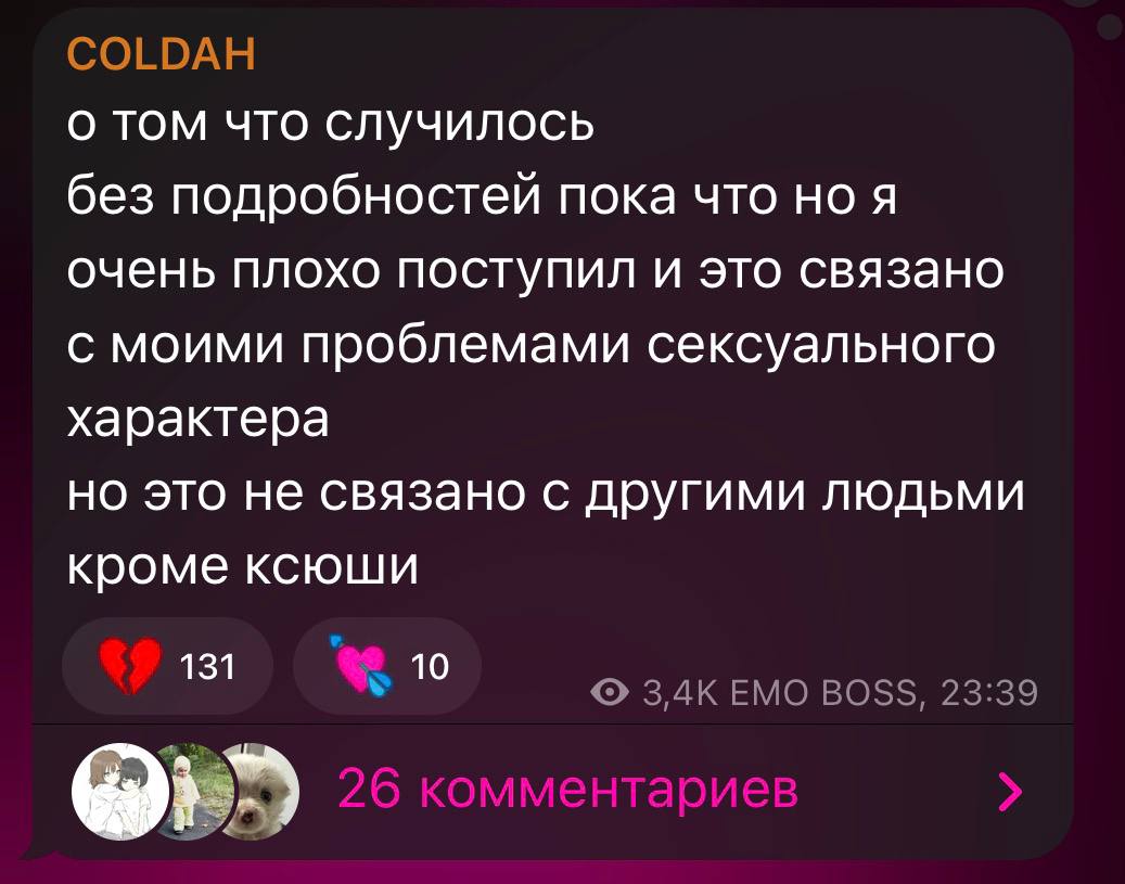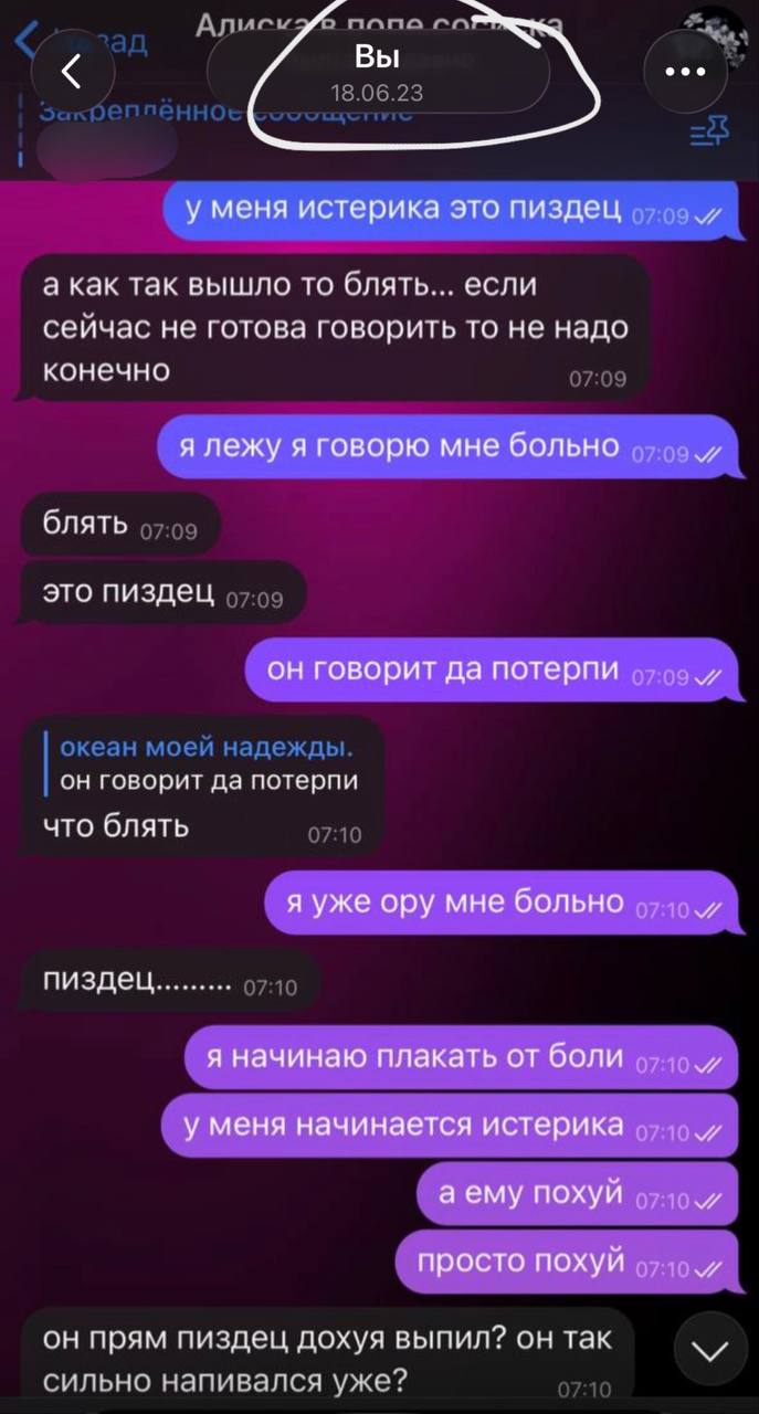 18 июня 2023 года мой бывший молодой человек совершил со мной насильственные действия сексуального характера. На тот момент ему было 25 лет(1998 г.р.), а мне было 16(2007 г.р.). Вечером 17 июня мы были вместе на мероприятии, затем ничего не предвещало беды, после мероприятия он попросил снять отель, так как на тот момент мы уже находились в отношениях я ему не отказала. Мы приехали в отель, а дальше все как в тумане, все дошло до того самого, но в какой-то момент я попросила его остановиться, потому что мне было невыносимо больно и некомфортно. Он меня не слушал, удерживал, просил терпеть. Я кричала, много раз просила его остановиться, но он меня не слушал. Когда все закончилось он по своей излюбленной схеме начал рыдать, падать на колени, просить прощения. Я в тот момент была в полном шоке и покинула отель, сказав что об этом мы поговорим потом, но я его не бросаю и чтобы он не переживал. (добрая душа блять) На следующий день в своем канале он написал пост, чем я могу подтвердить свои слова, а так же перепиской. Конечно затем все замялось и забылось, но определенный отпечаток в моей психике это оставило, и теперь я никак это не исправлю. Проблема в том, что на тот момент у нас такая ситуация произошла впервые, но из рассказов девочек, это его стандартная тактика и никакой вины человек за свой поступок не чувствовал никогда. Девочки писали, что после того самого, он так же плакал, просил простить, не знал что на него нашло. Вопрос, должен ли человек не контролирующий свои низменные животные инстинкты находиться в обществе и признаваться им?