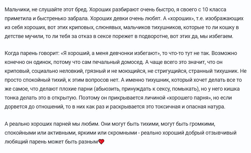 ТЯНСКИЙ DEMO-РЕЖИМ Пока был конфетный букетный период, ебались с тян как кролики, сосали письки и сиськи друг другу, обнимались до посинения, не было негатива с ней, романтика вся хуйня. Стоило с ней съехаться, тян начала только жрать, лежать, вести себя как ебаный ребенок и играясь в свои бабские хобби. На мои любые просьбы как то с ней взаимодействовать сексуально или ожидая от нее инициативу в этом плане, ведет себя как аморфное чудо, извивается как змея со словами НЕ ХОЧУ / НЕ БУДУ / ЗАЧЕМ / НЕУДОБНО Я видите ли ей указываю, границы ей нарушаю. Посрались. Тусим теперь в разных комнатах. После этого начала раздражать меня дико, да и та в свою очередь тоже не отстает негативно реагируя на мои попытки как то с ней поговорить, в общем это все не приводит к желаемому результату, да и вообще вылилось в то что она меня вообще нахуй сейчас не возбуждает, появилась апатия и ненависть к ней. Проще блять подрочить чем с ней договариваться начать приставать, а мне это нахуй не уперлось действие куколда, унижаться ради пизды я не намерен. Ебля это магия, спонтанная должна быть и дикая, без уговоров и подготовки к нему. Видит же что после обоюдной ебли я сразу становлюсь другим человеком, спокойным, добрым, рассудительным, да и баба ведет себя спокойно, все у нас ахуенно, но эти последние 4 дня у меня горит жопа, срач, ругань, молчание. Ей похуй на это. Мне нет. Получается бесконый круг ругани, слез, ебли, опять нормальное состояние пару дней и все по новой нахуй, знаю что я не первый с такой траблой, но хотелось бы почитать ваши истории на эту тему и мнения что я нормис дебил долбоеб Ебаные бабы, что блять с ними не так, как контрить эту хуйню?