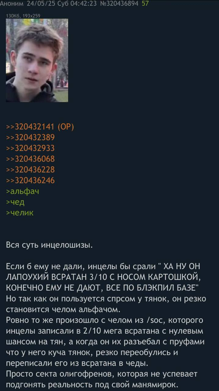 Да съебите уже со своими биопроблемами. Тянкам важна самоуверенность и высокая самооценка. Именно поэтому наташки дают Алишерам на ура. Развели тут клоповник инцельный, карлики.
