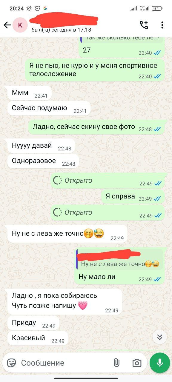 >>325195413 что ужасного в его фотке? Первая скинула ровно такую же фотку, как и он. Хотя.. Увидев ее фотку, я бы тоже написал, мол "уже передумал" или заигнорил