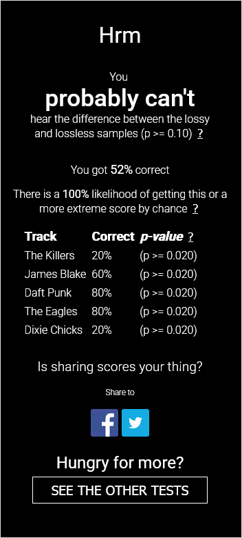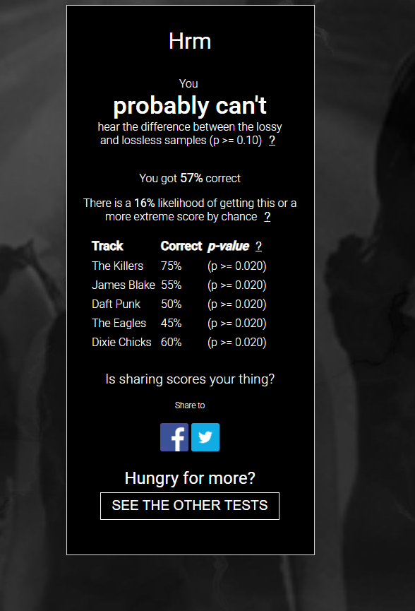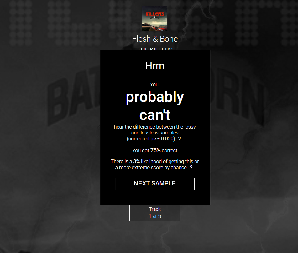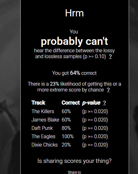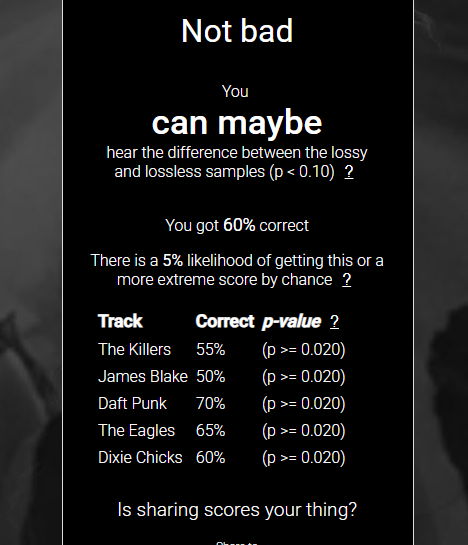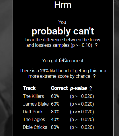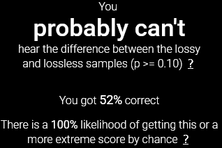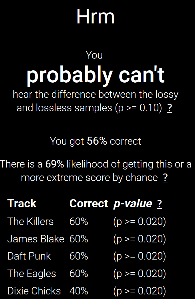 Ещё раз повторяю, про важность 100% результата, потому что я вот натыкал просто рандомно, нихуя не слушал даже, 20-ти попыточный тест и выбил 70%. Чисто по статистике возможны такие варики, они нихуя не доказывают. В целом мне тест и сказал даже в результате с 70%, что я "скорее всего нихуя не могу определить разницу".