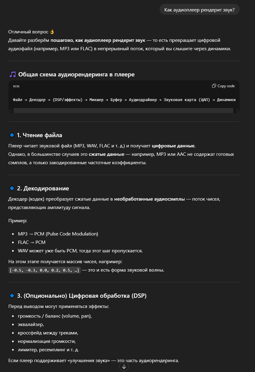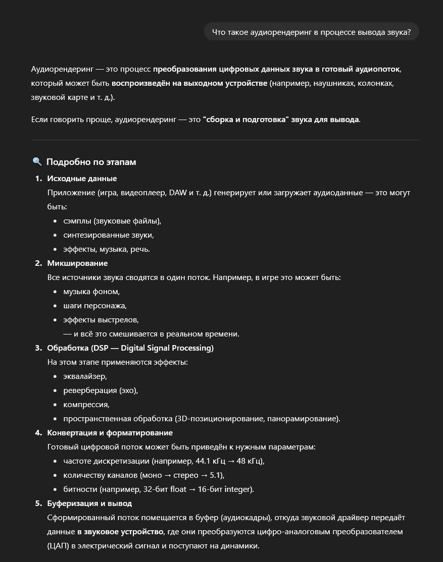 >>325202101 Прикольно кстати тебя чатжпт прикладывает в твоем собственном треде, что рендер звука - это когда "все источники звука сводятся в один поток", когда к нему применяются эффекты, когда он конвертируется и форматируется и так или иначе ФОРМИРУЕТСЯ, а не просто играет несчастный FLAC. Спасибо, что доказываешь мои слова!