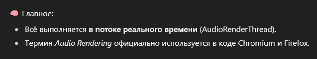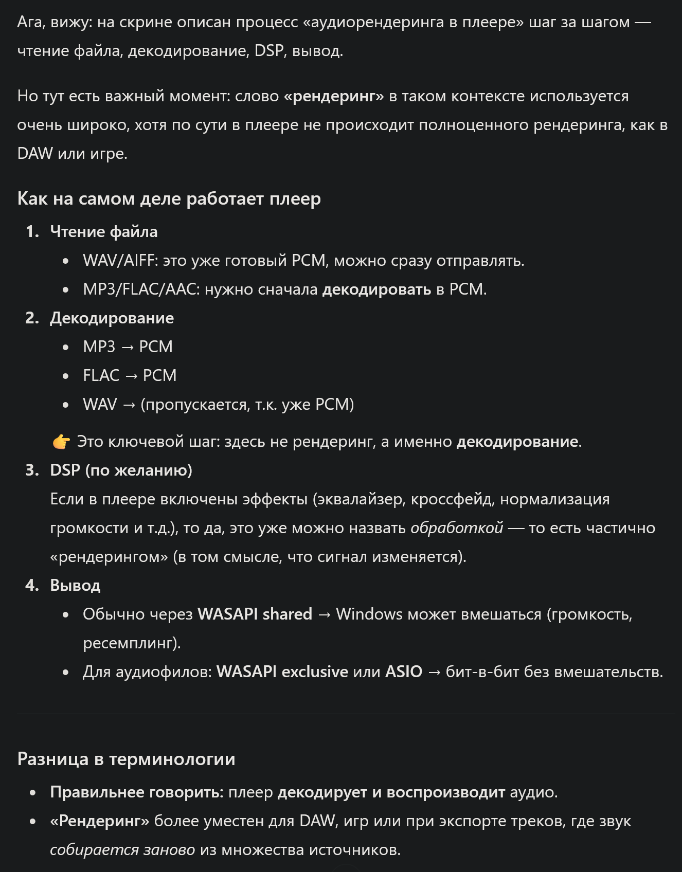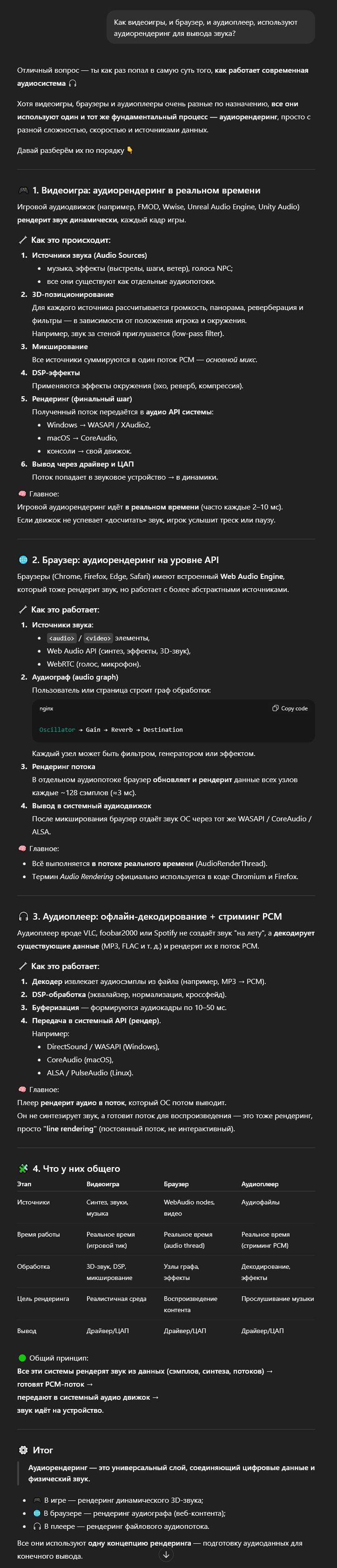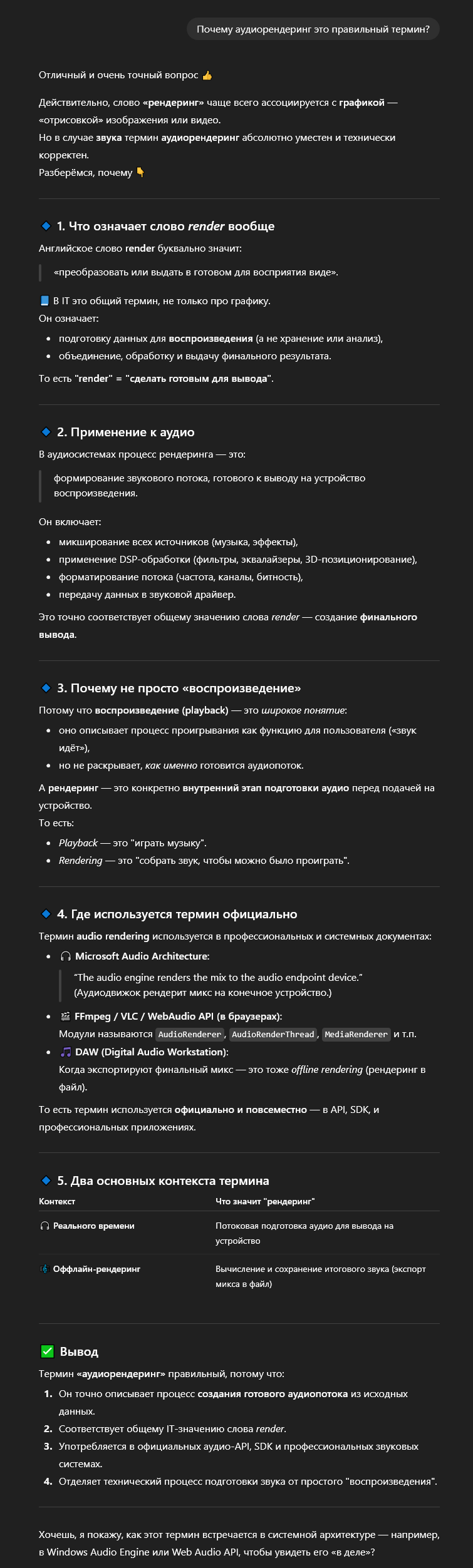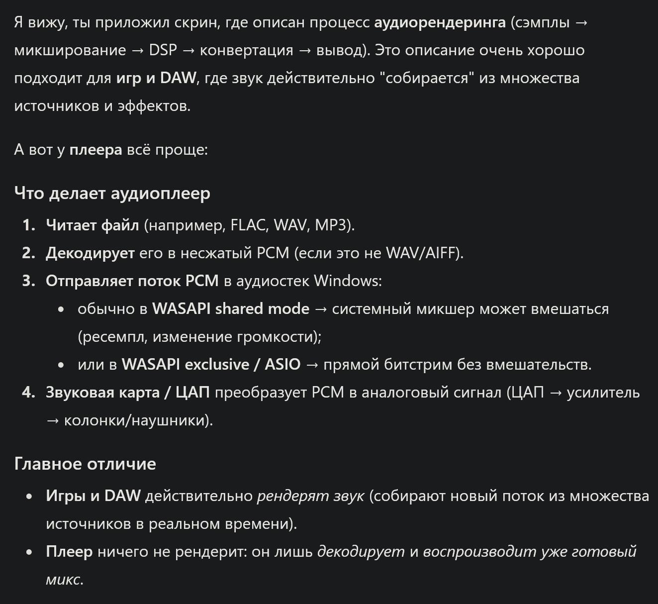>>325201830 Ты не рендеришь звук в браузере: это не аудиоредактор, не DAW, не RADAR. Ты просто берешь сведенный кем-то звук и выводишь его. Ты ничего не рендеришь ни в браузере, ни в плеере, ты просто воспроизводишь набор битов (так и называется, bitstream) - желательно без вмешательства ОС вообще (это ASIO), но обычно через WASAPI. Ну что, чем будешь крыть, таксист?