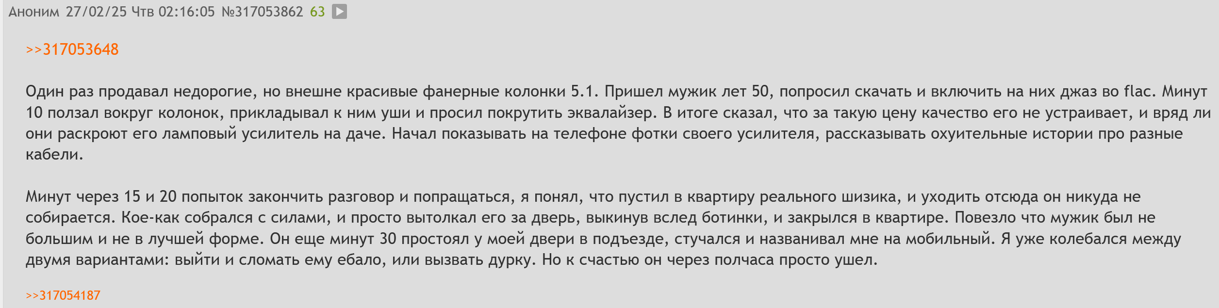 >>325201397 Кто о чем, а латентный о хуйцах. Ты давай рассказывай, как ты, знатный аудиофил, слушаешь музыку на своей системе. А то виляния переходят в ультразвук.