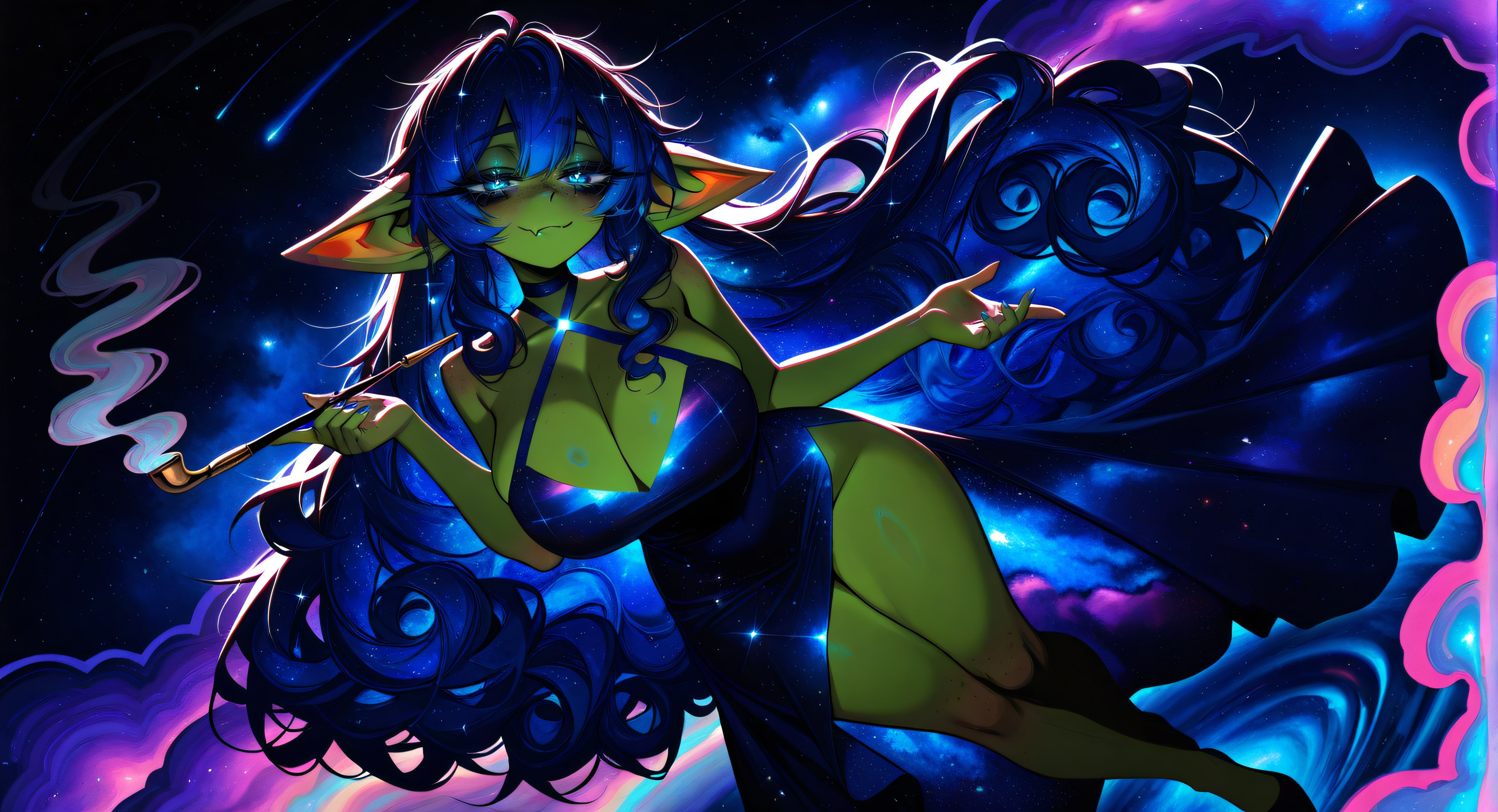 Анон с Гобой, а давай ей волосы типо вот такого сделаем, магические синие и вьющиеся, и платье и платье типо с космическим эффектом как тут крылья. Можно её её трубку с каким нибудь дымом цветным дать или выпивку святящуюся.
