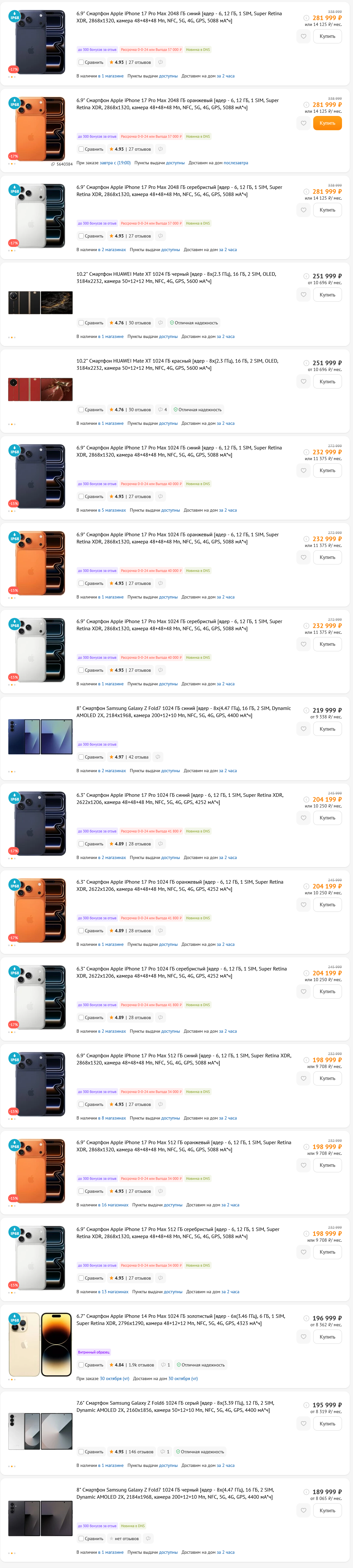 >>325746507 Ну если не пиздеть, то почти всю первую страницу занимают айфоны, они всегда самые дорогие на старте и меньше всех теряют в цене. А затесавшаяся среди них пара экспериментальных моделей - это экзотика, которая в топы продаж не входит даже близко. Самые продаваемые iPhone 16, iPhone 16 Pro Max, iPhone 16 Pro. Конкурирует с ними по популярности в 2025 году Samsung Galaxy A16 5G за 15 199 ₽, Xiaomi Redmi 14C за 10 799 ₽, Samsung Galaxy A06 за 12 199 ₽