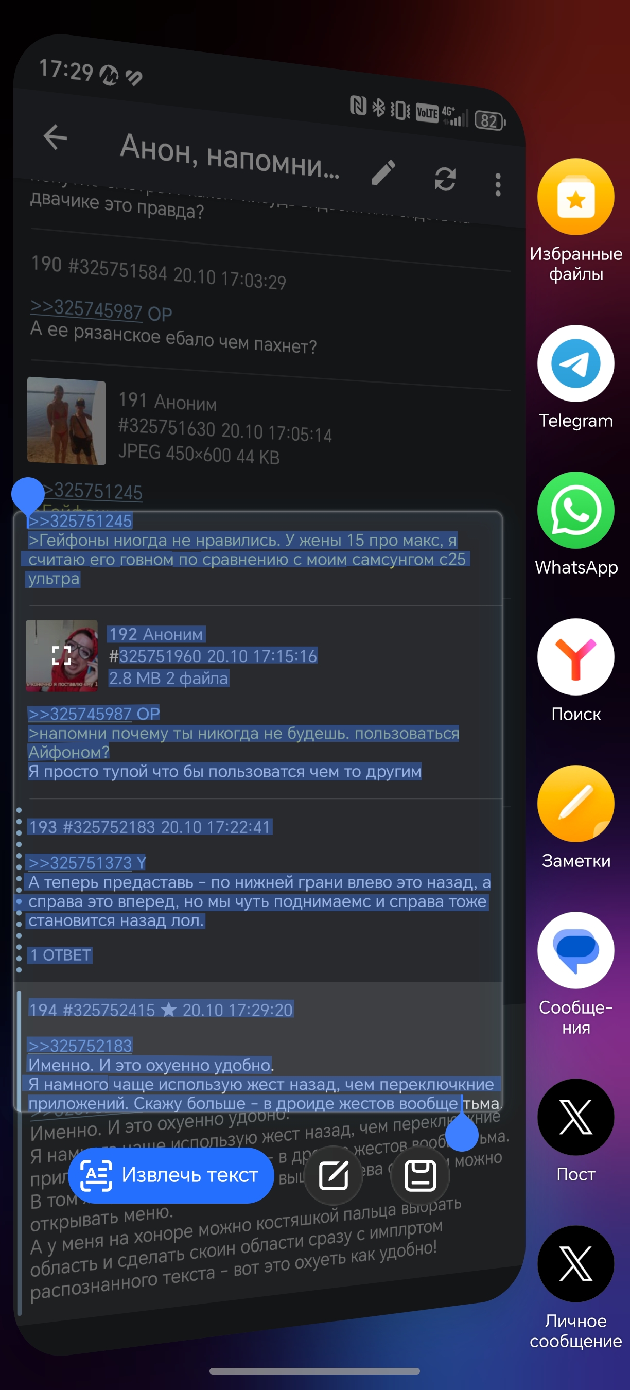 >>325752183 Именно. И это охуенно удобно. Я намного чаще использую жест назад, чем переключкние приложений. Скажу больше - в дроиде жестов вообще тьма. В том же дашчане подняться выше и слева свайпом можно открывать меню. А у меня на хоноре можно костяшкой пальца выбрать область и сделать скоин области сразу с имплртом распознанного текста - вот это охуеть как удобно!