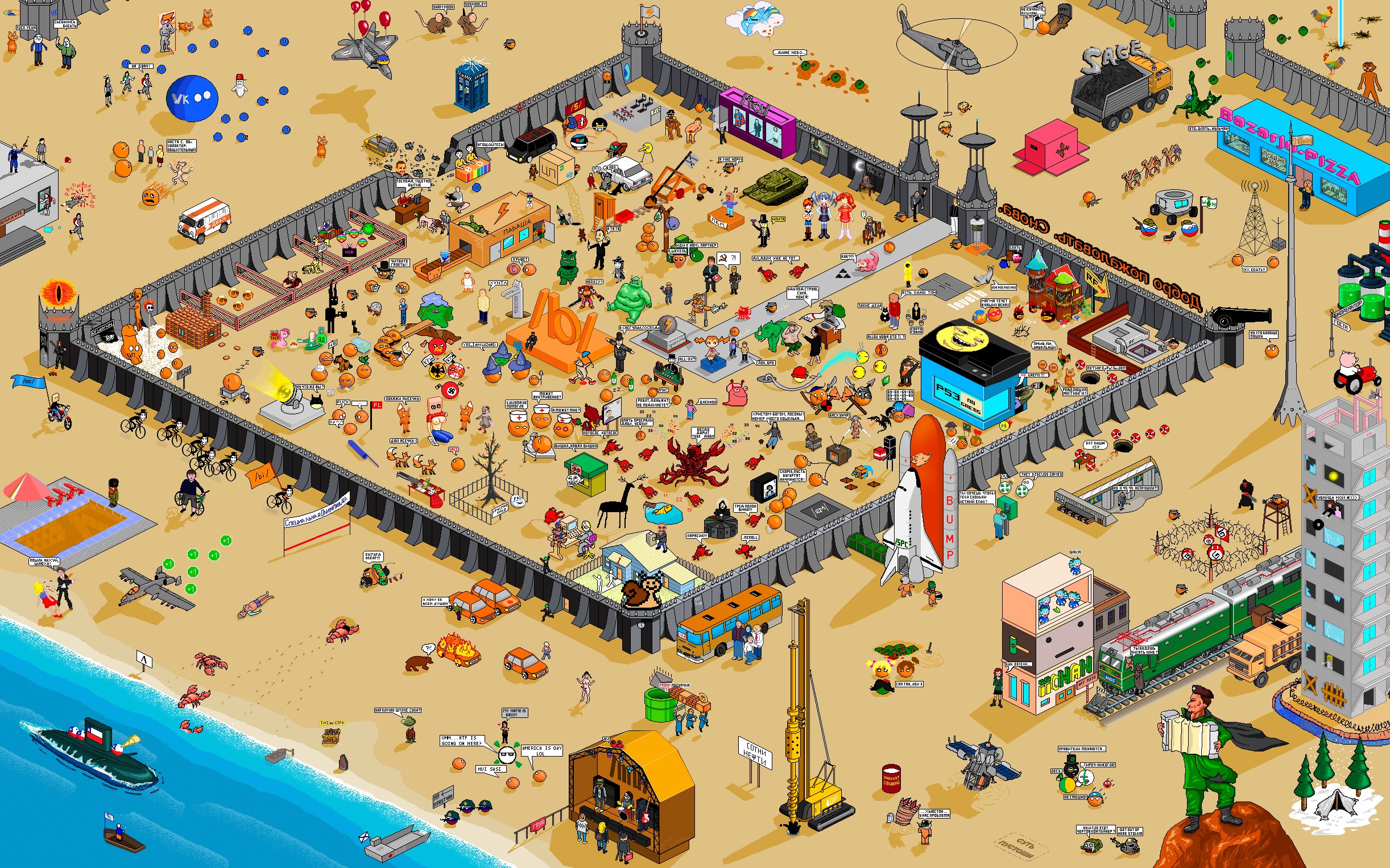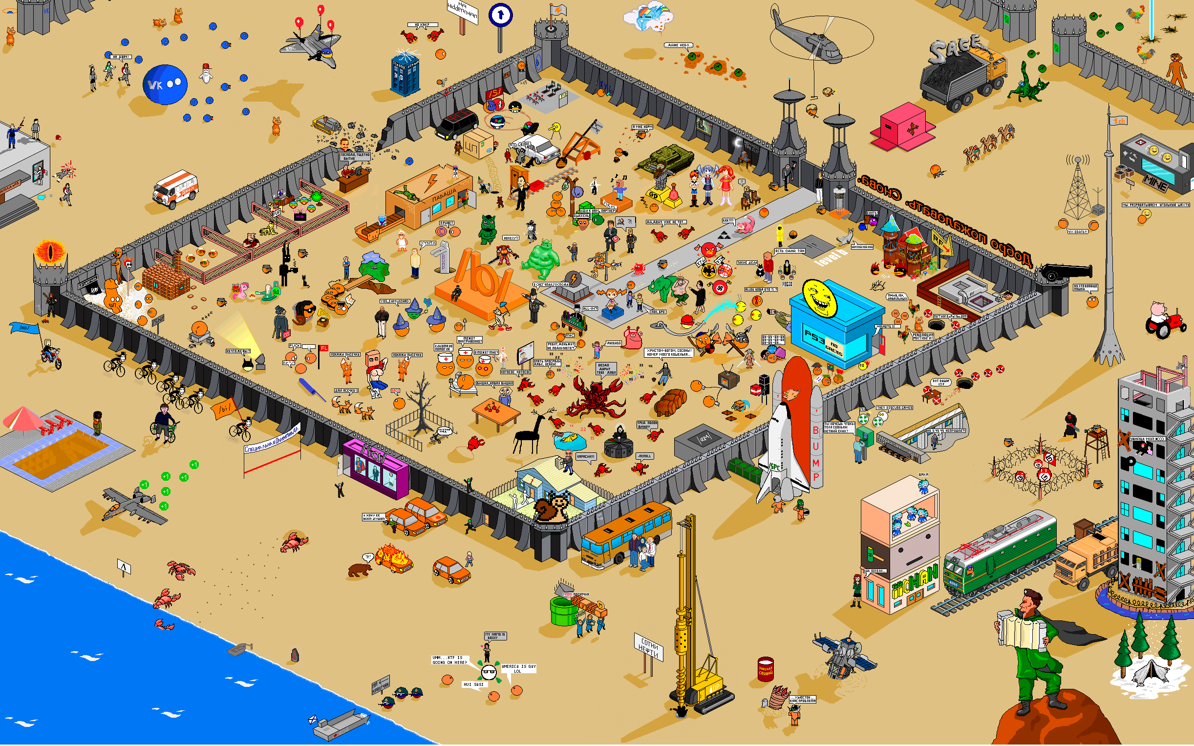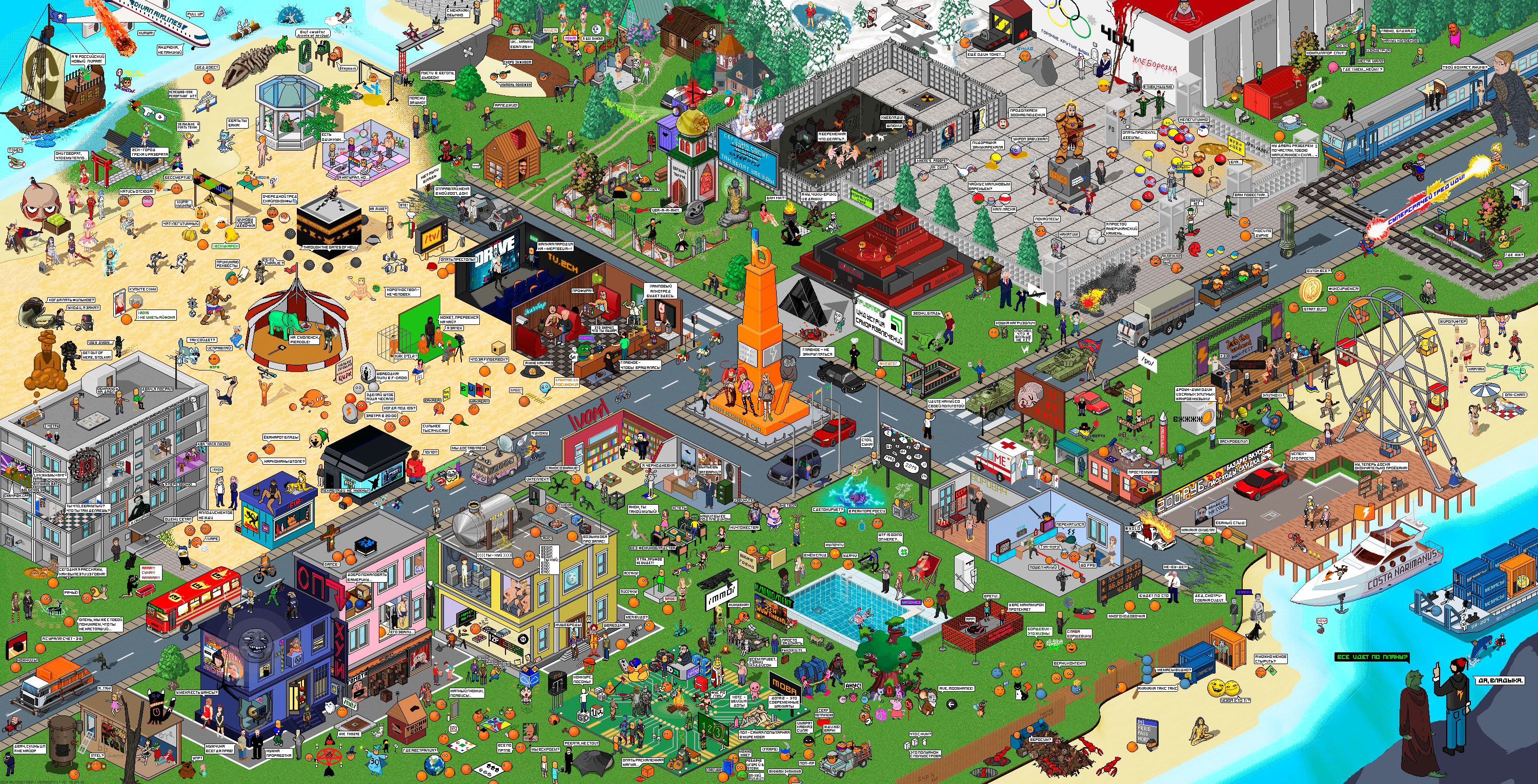 Я хочу запилить что-то подобное алтогевру 2015 года >>325752879 Мне так нравится этот ламповый город, я готов подолгу его разглядывать. Там аноны всё сделали по уму. Всё изначально на зоны разделили - вот вам дорожное кольцо в центре с обелиском, городская зона с многоэтажными зданиями, побережья, городская площадь для политача и лес в самой верхней части. Всё нарисовано чётко и симпатично: практически нет нигде шакалов, цвета хорошие, насыщенные, приятные глазу. Сами идеи артов тоже классные. И что-то мне подсказывает, что арт пилили (и возможно допиливали арты от анонов) малая группа анонов или даже один анон, потому что всё выполнено хорошо и на одном уровне.
