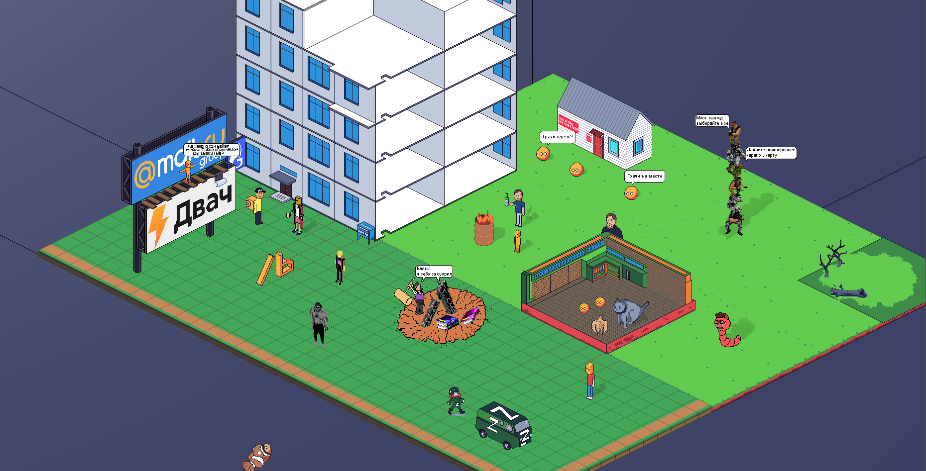 Вот я и хочу равняться именно на этот алтогевр. Он вообще послужил мне главным источников вдохновения. У меня давно была можно сказать мечта запилить такой-же пиксельный город-Двач, но ещё круче: более проработанный, больше всяких интересных локаций, и населить его всякими двачерскими персонажами и сценками, изображающие те или иные мемы и события