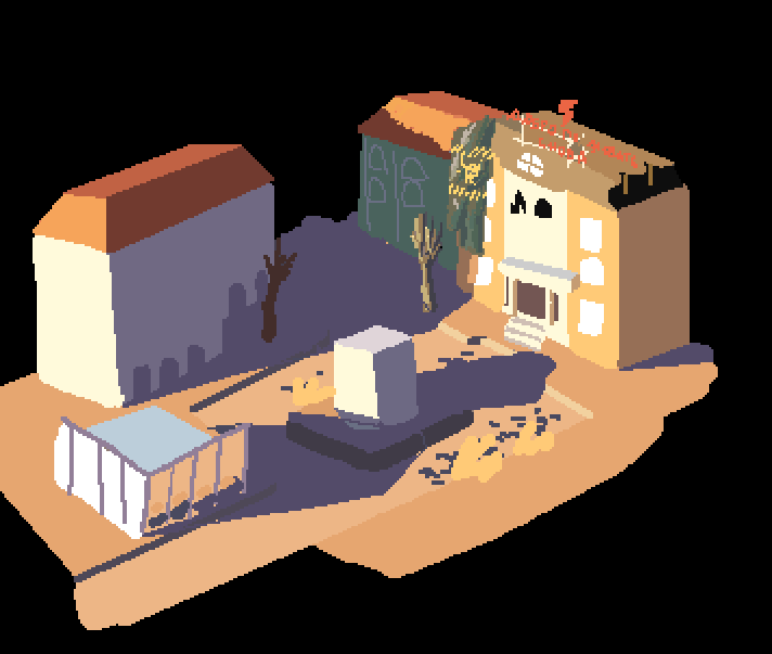 Вот пример того, как будут выглядеть цвета арта с учётом освещения. У каждого объекта будут падающие реалистичные тени. Время суток будет - закат, и длина теней будет соответственно длинная, раз солнце низко. Угол тени я задал не по изометрии, а немного сдвинул так, чтобы правая сторона объекта оказалась затенённой - так выглядит красивее и подчёркивает его форму.