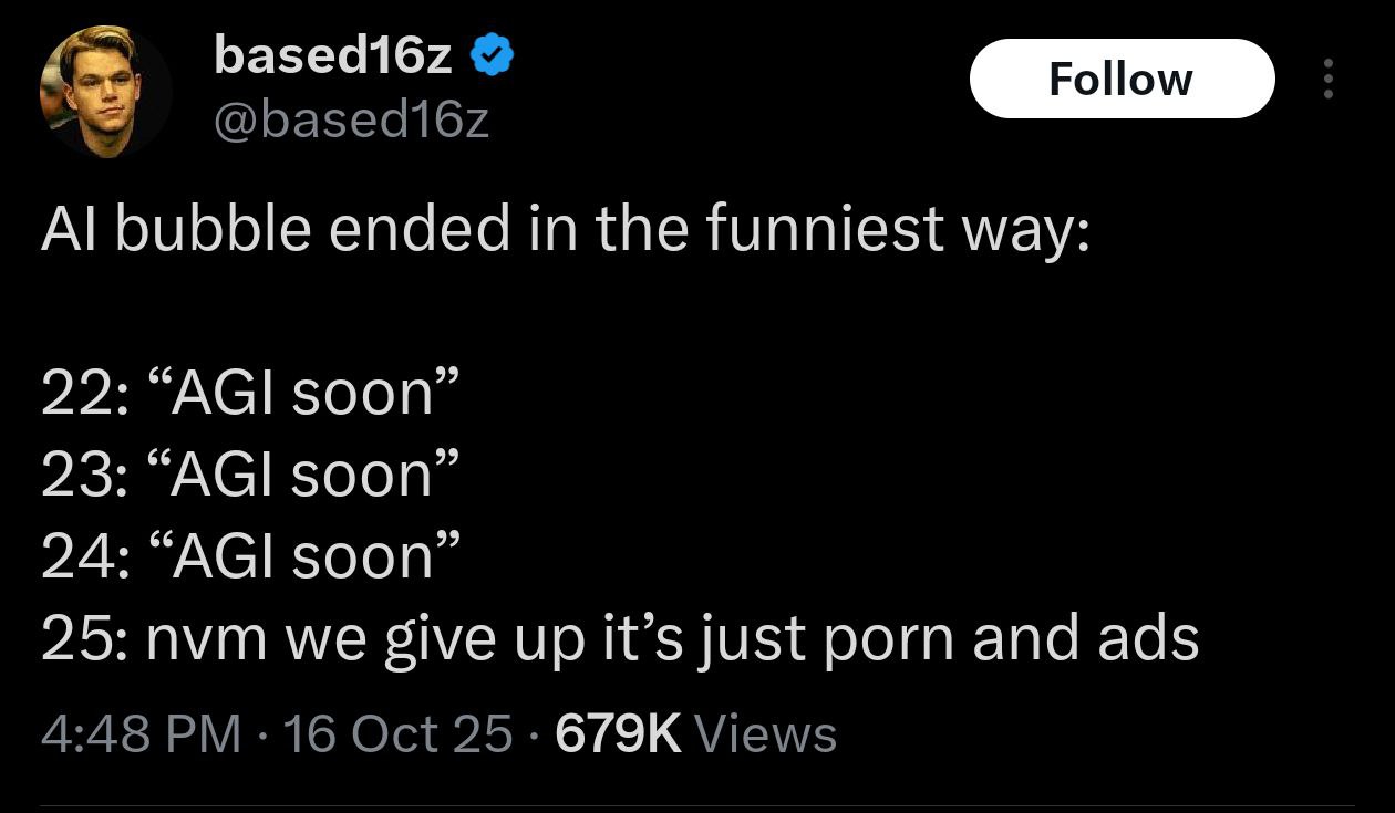 >>325767957 Да здесь мало кто сидит из хоть немного следящих за мировыми новостями на эту тему. Никто, например, не в курсе, что OpenAI и другие флагманы индустрии год за годом теряют миллиарды долларов и фактически существуют на дотации инвесторов до сих пор, не окупив даже изначальных производственных затрат. У того же чатджипити в общей сложности порядка 20 млрд чистых убытков было на начало 2025 года, сейчас уже за 25 скорее всего перевалило. Четыре года нейронки существуют, но никто пока не получил серьёзных денег с них. Пузырь астрономических масштабов.
