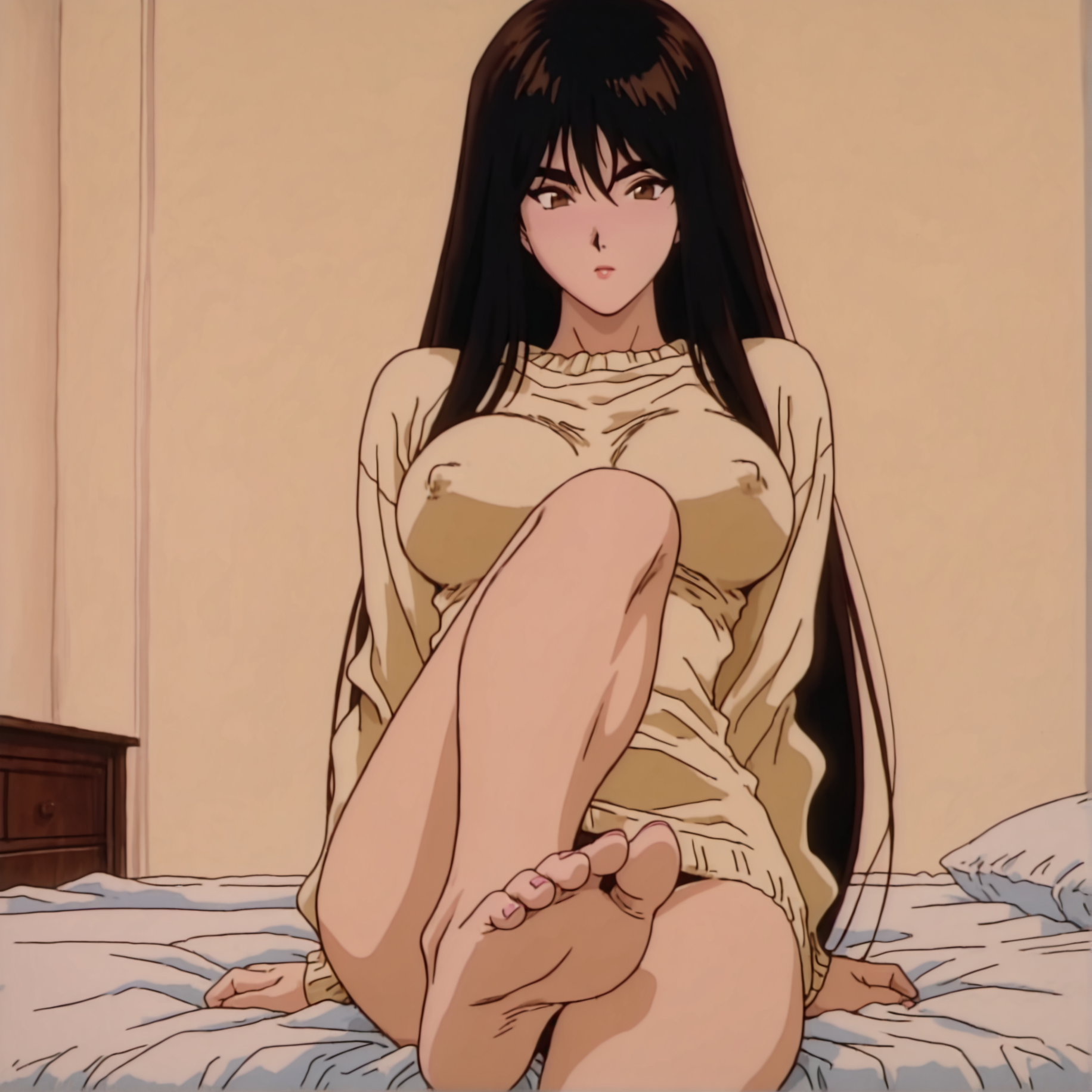 Реквестирую эту девочку. Они сидит в этом свитере на кровати, читает книгу, без трусов, с раздраженным видом, и заставляет Кинтаро красить себе ногти на ногах (т.е. одна нога согнута в колене с опирается пяткой на кровать). Кинтаро побит, плачет и одновременно краснеет, пускает слюни.