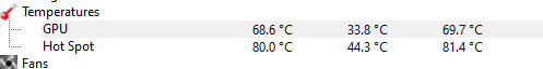 >>325782011 Посмотри спецификацию на свою карту. У разных чипов разные предельные температуры. Но имхо 80 это много, у меня 4090 до 70 редко прогревается