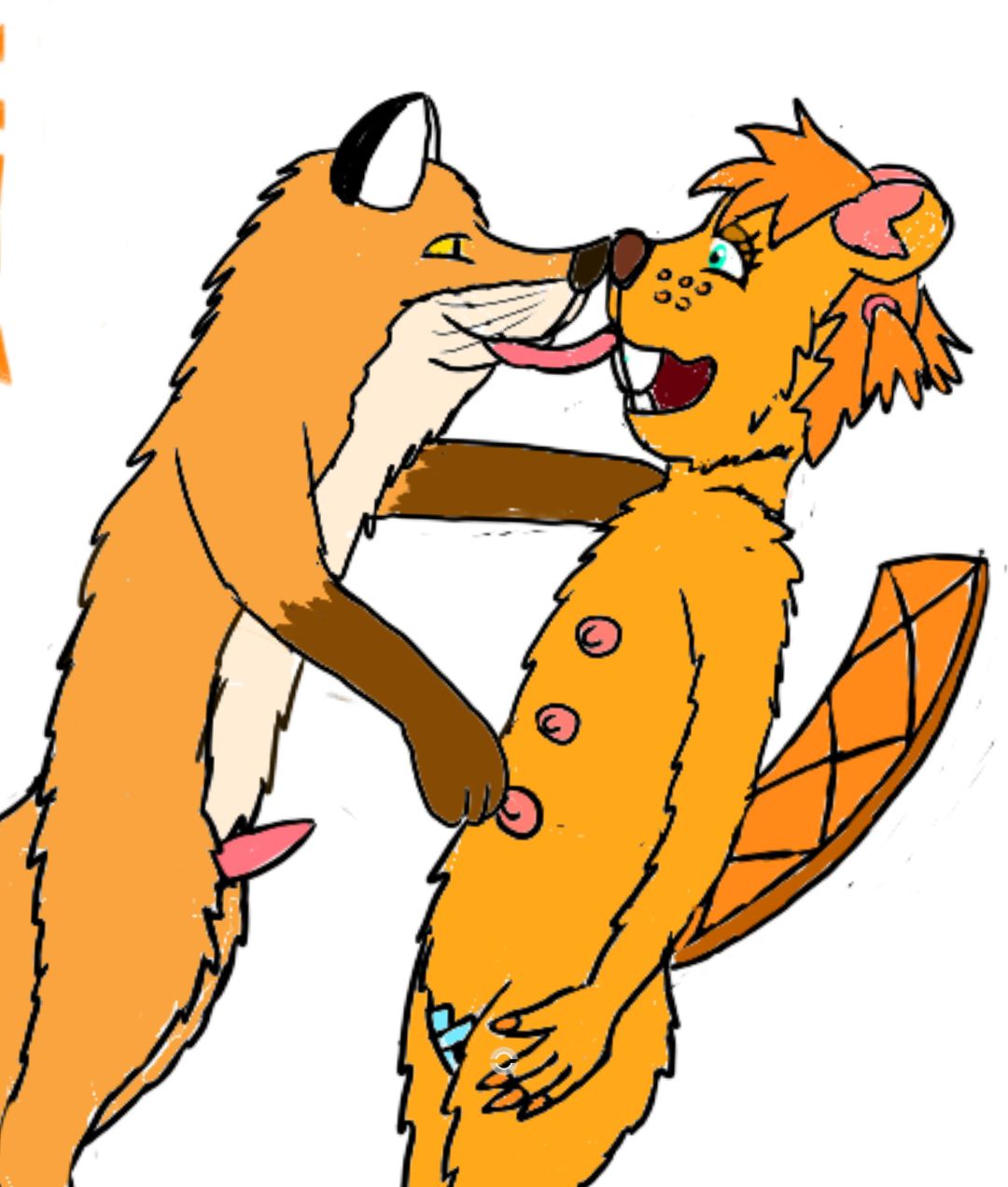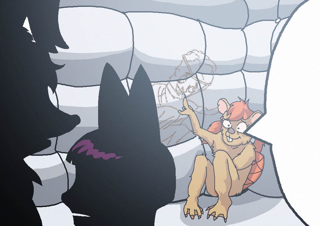 Рыжая бобриха Рыжелина (1-3) с водной ящеркой Несси (4) пьют из деревянных бокалов. Несси чуток алкашка и закусывает спиртное огурчиком. Рыжелина же трезвеница с соком, но от силы бобровой привычки откусила кусок бокала. За это Несси комично (пьяная ведь) говорит "Завязывай".
