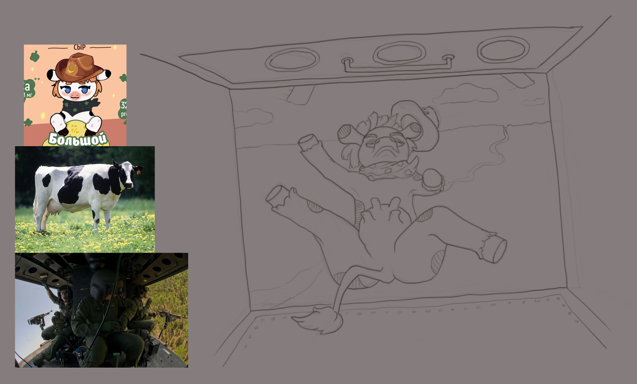 Эта (1-2) киса с 6 сисями зависает в телефоне иль ноутбуке, как из экрана, словно портала, вылез Волк из "Приключения Пети и Волка" (3-4) зовёт мурлыку спасать царство иль государство от мышей, хватая кису за попу, как альфач и мелкий персонаж (рост обусловлен лором "волшебного волка", а не стилем).