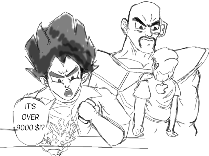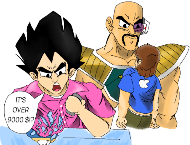 Пусть Веджита в одежде из первого пика будет находиться в магазине Эпл вместе с Наппой(второй пик)и разбивая витрину с айфонами будет кричать "It`s over 9000 $?!", а Наппа за грудки поднимет работника магазине.