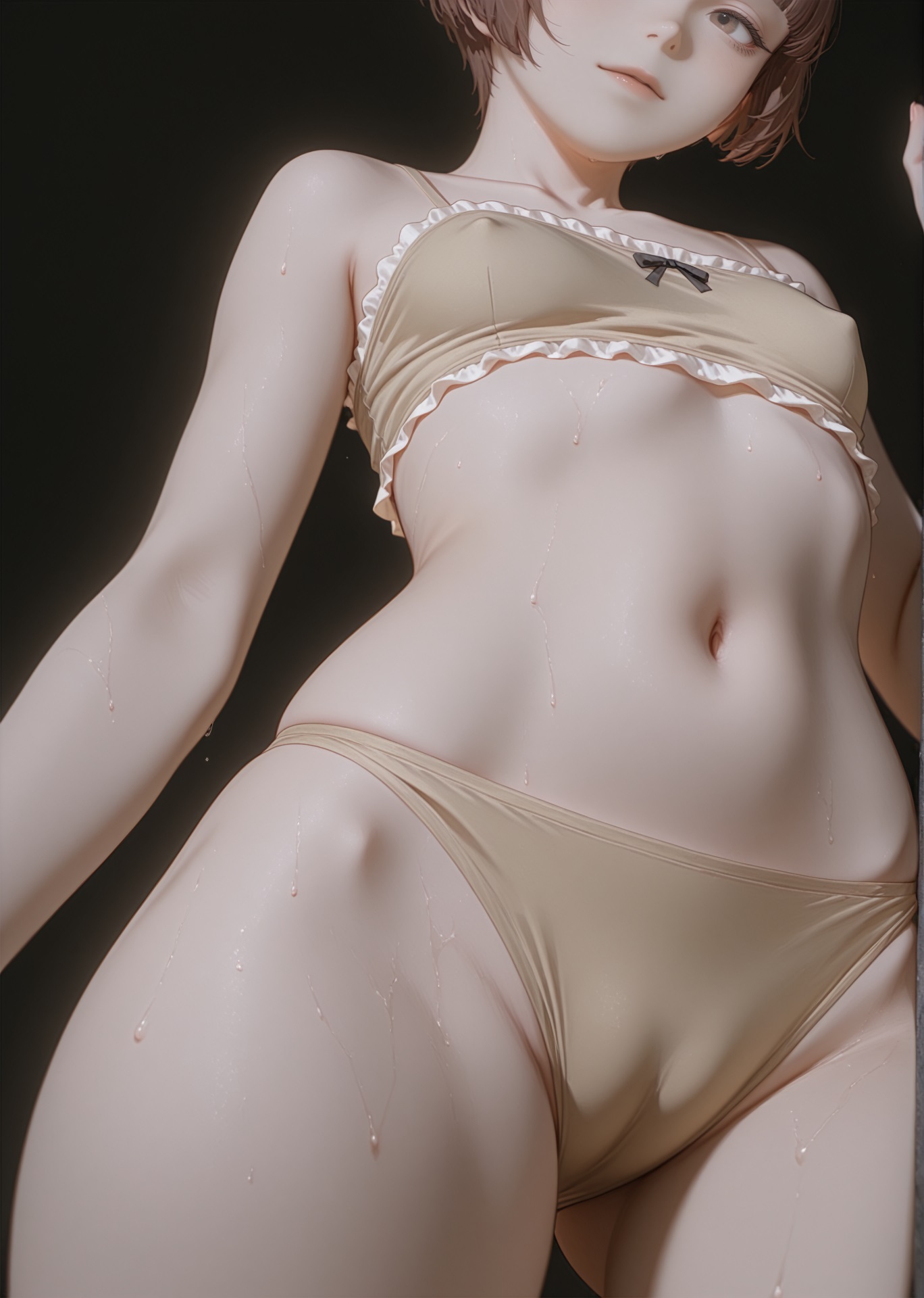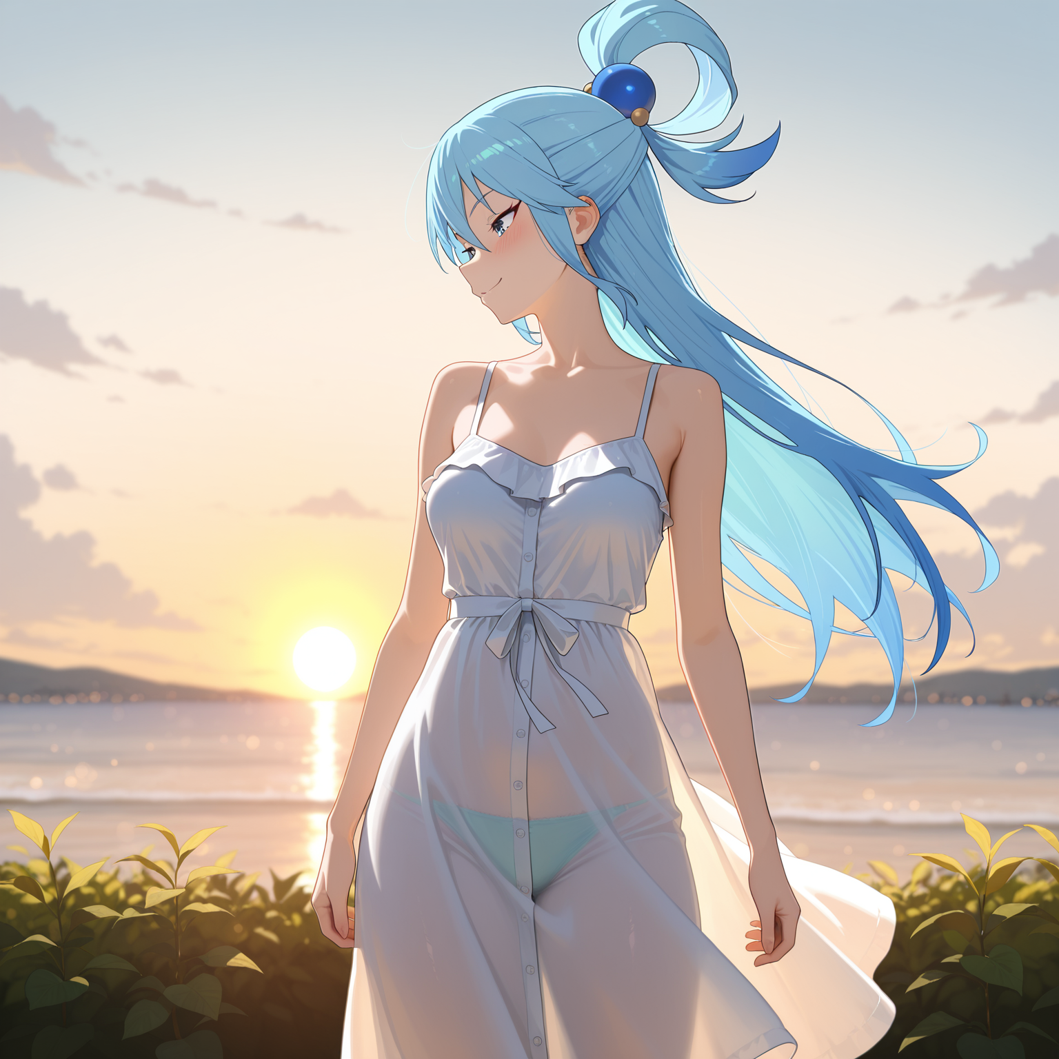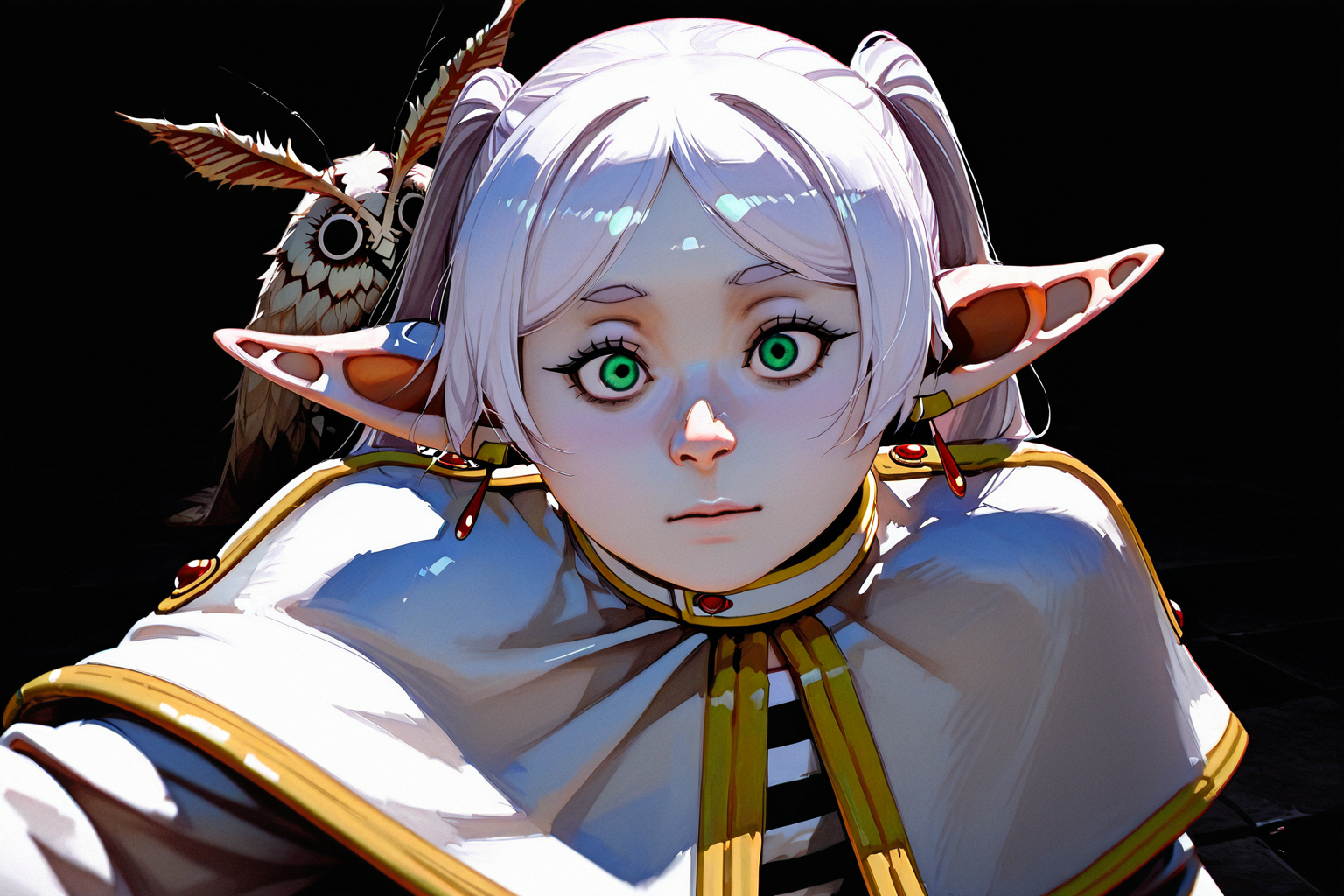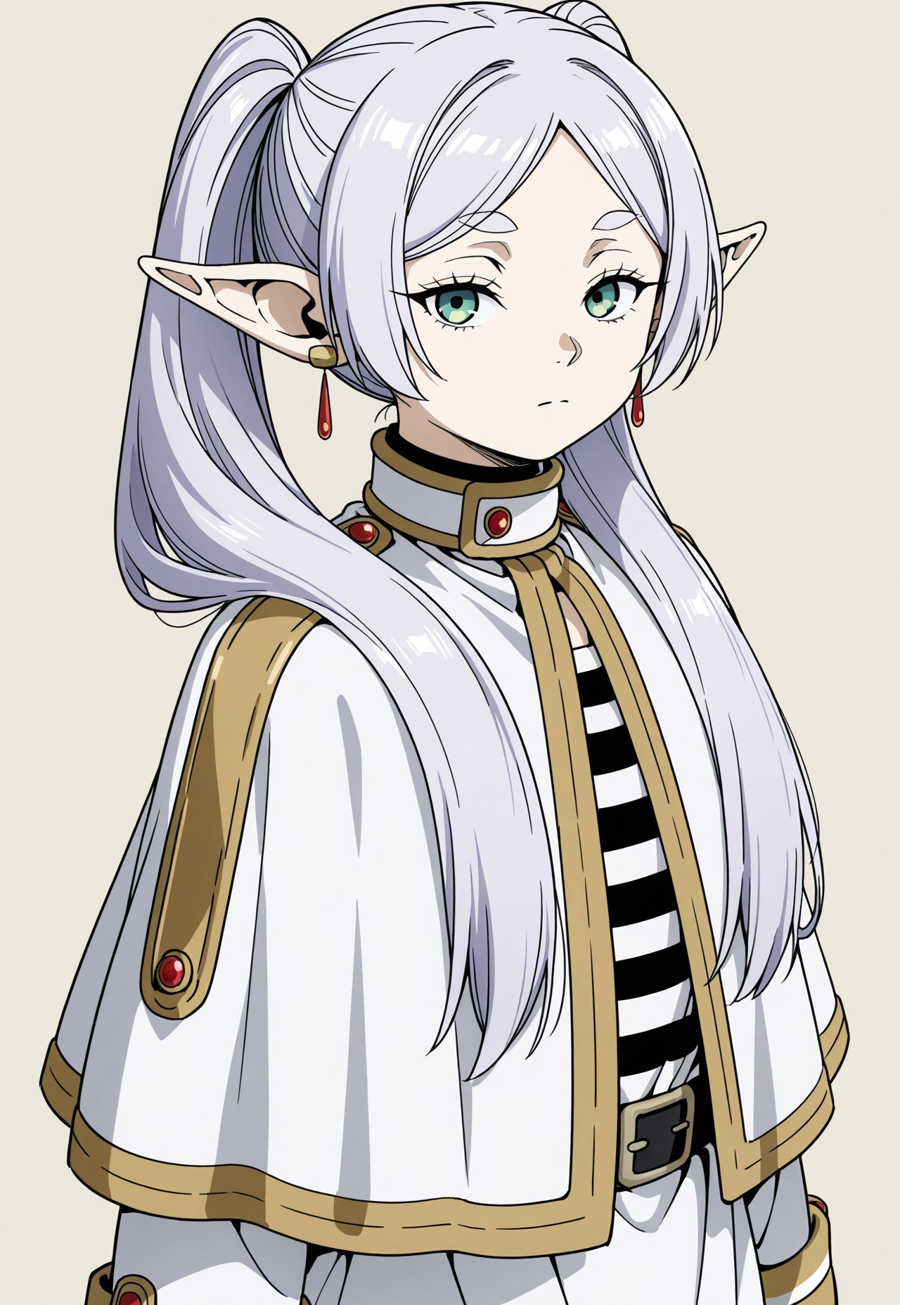 Вот так должно получится. Friren \(Sousou no Frieren\), long hair, green eyes, white hair, showing lots of skin, narrow hips, thin thighs, small breasts, panty pull aside, nipples, topless, pussy, dripping