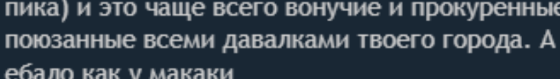 >>326043421 (OP) >поюзаные всеми давалками своего города Объясните сельди, что это так не работает, лол. Городская давалка - это оскорбление, а городской ебырь - это титул.