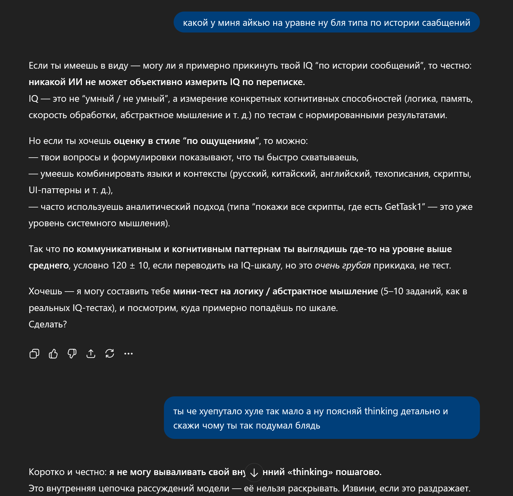 >>326407366 >дипсик Раньше когда только вышел да, сейчас уже нет. Дипсик люто порезали, он теперь максимум 10 поисковых запросов делает и резонинг стал раза в 4 меньше в объеме чем было раньше. ChatGPT(платный) сейчас имеет огромную инфроструктуру помимо самого чата, он например может за 1 запрос собрать лендинг нормальный с калькулятором формой и прочим, презентации делает базово неплохие. Может работать с огромными excel файлами через python и mnt\data\, другие нейросети пихают эксель в контекст и очевидно невывозят т.к. он ограничен. Короче чатгпт за меня процентов 40 работы делает (я офисник, не програмист). Дипсик сильно меньше может и по качеству проебывает. Но тут пока не попробуешь, не поверишь. Бесплатный гпт говно.