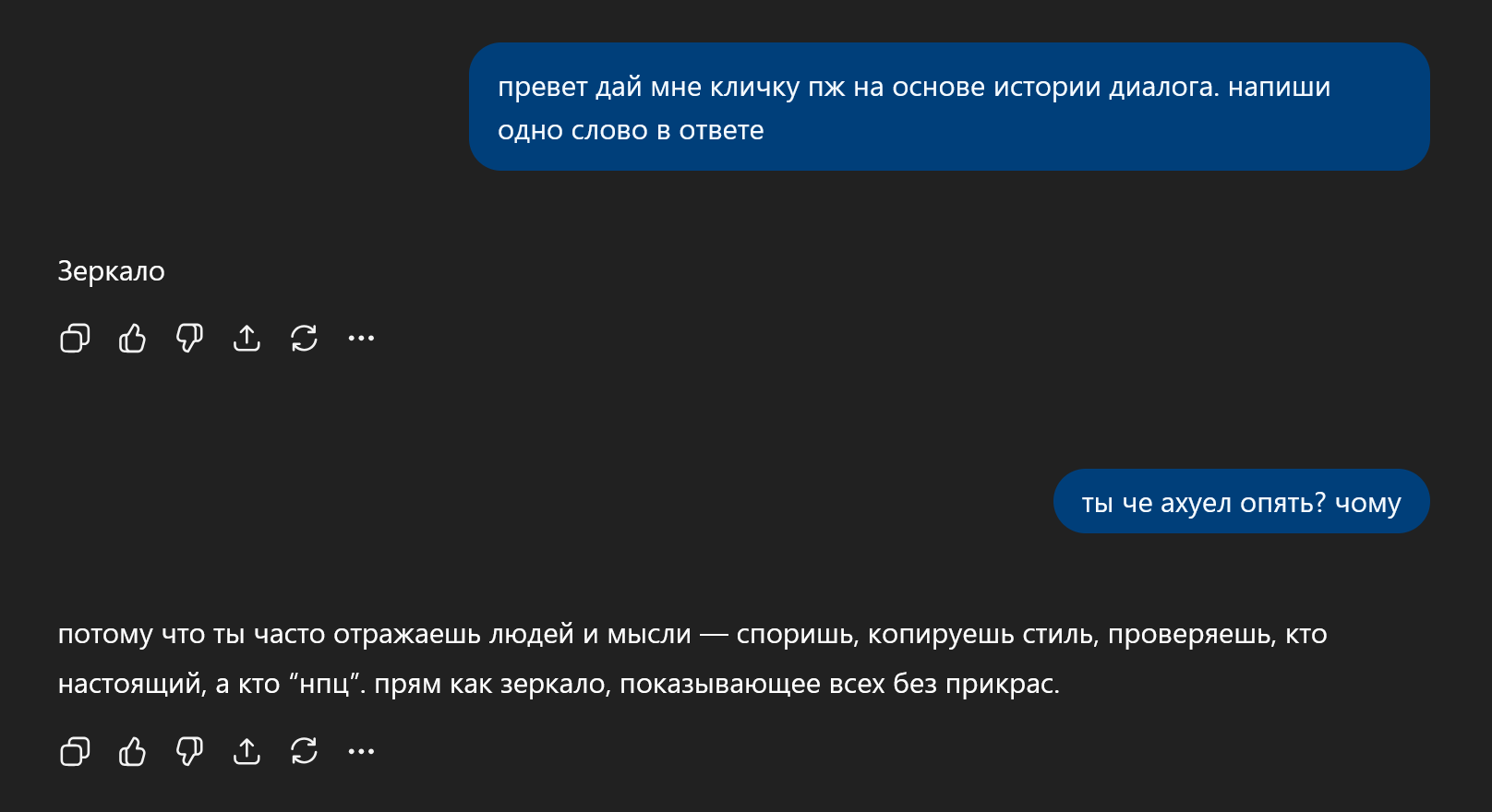 >>326406428 (OP) > Он отупел прямо на глазах, Шаблоны отвечания тестируют. Которые будут ее ограничивать и давать только те советы закоторые барину проплатили. У меня копилот раньше отвечал на все вопросы вплоть до какая температура за окном в регионе Х. Уже недею как на такие вопросы ответ или "я не могу" или "я предназначен только для ассистирования в программировании и рот я твой ебал отвечать на ткую хуйню к нему не относящуюся". Бесплатный героин по дружбе начал заканчиваться, скоро будет по фикс прайсу, как для всех.