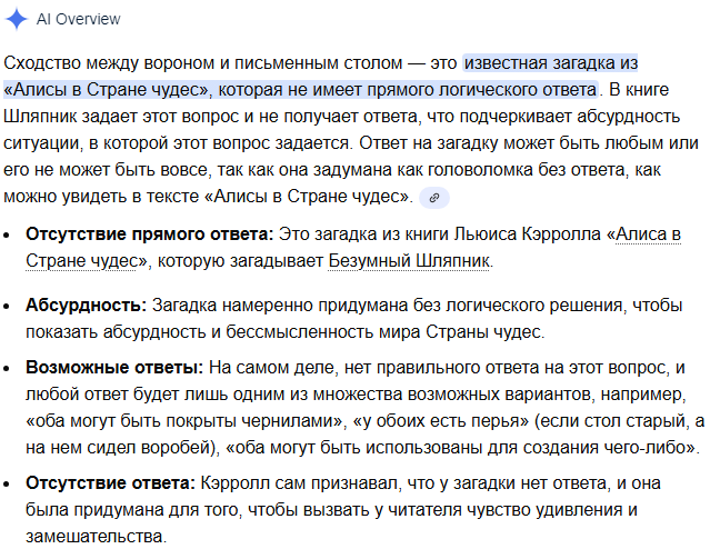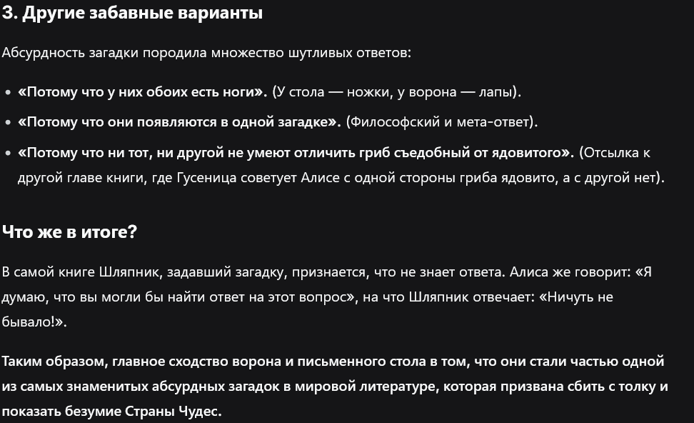 >>326415307 Это классическая загадка из «Алисы в Стране чудес» Льюиса Кэрролла. В самой книге Шляпник и Заяц так и не дают прямого ответа, что породило множество interpretations.