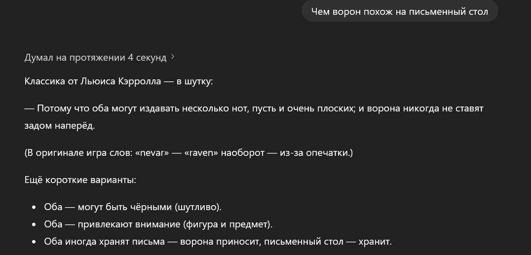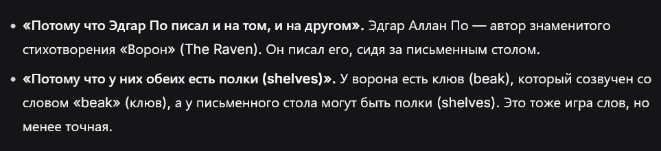 Оба могут давать «отклонения». Ворон (raven) может создавать отклонения в полете (flight). Письменный стол (writing-desk) может создавать отклонения в написании (writing — игра слов: writing/writing). В оригинале игра слов строится на «nevar» (raven наоборот) и «never» (никогда), но это сложно перевести.