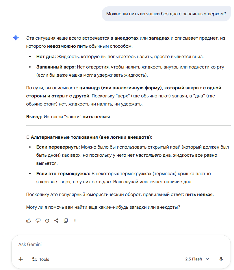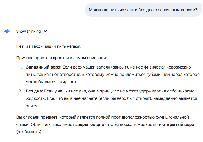 И тем не менее, доверять свою жизнь перемножителю таблиц без образования это херовая идея. Раньше он рекомендовал, как можно приготовить пиццу с клеем. Теперь эту ошибку залатали, но принципиальная проблема осталась. Эта хуйня любит галюционировать но ответы все равно звучат правдоподобно, и это хреново. Кроме того, для некоторых вещей нужны глаза и пальцы опытного специалиста.